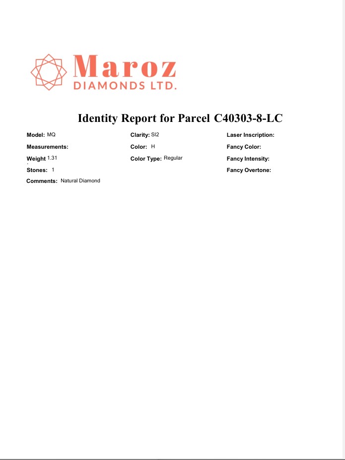 DIAMANTE 1,31 CARATI COLORE H - PUREZZA SI2 - TAGLIO MARCHESE - CERTIFICATO GEMMOLOGICO MAROZ DIAMONDS LTD MEMBRO ISRAEL DIAMOND EXCHANGE - NUMERO INCISO AL LASER NELLA CORONA - C40303-8-LC