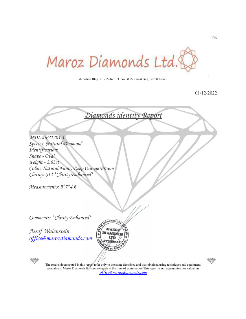 DIAMANTE NATURAL POLISHED 2,03 CARATI COLORE FANCY MARRONE ARANCIO INTENSO - PUREZZA SI2* - TAGLIO OVALE - CERTIFICATO GEMMOLOGICO MAROZ DIAMONDS LTD MEMBRO ISRAEL DIAMOND EXCHANGE - F21201-1