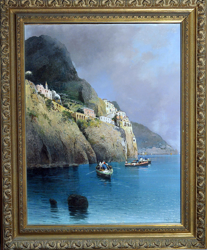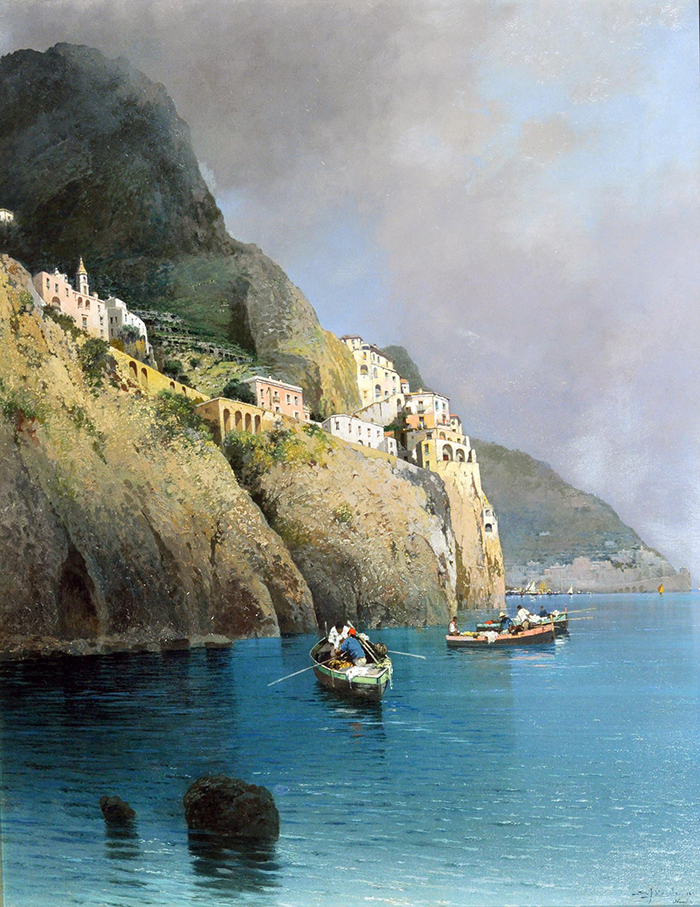 Petruolo Salvatore (Catanzaro 1857 - Napoli 1942) Costiera amalfitana olio su tela, cm 67x53 firmato iscritto e datato in basso a destra: S. Petruolo 1891 Napoli