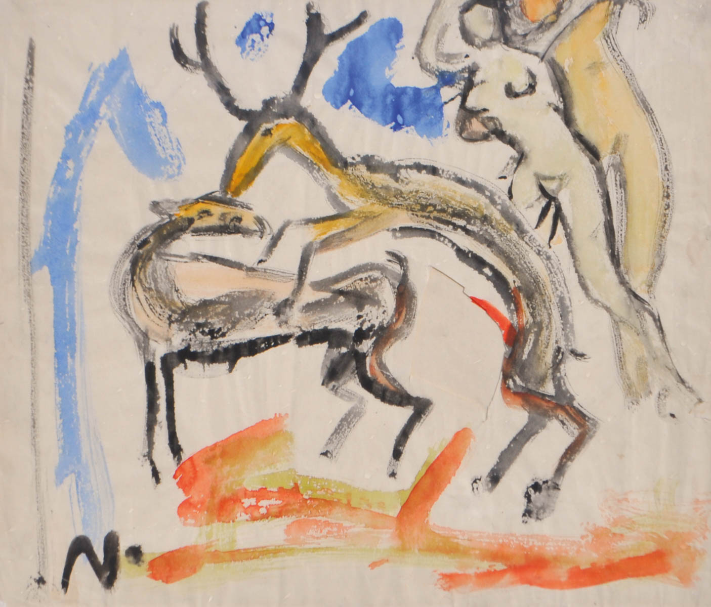 Artur Nikodem (Trient/Trento 1870 - Innsbruck 1940) Salto del cervo;Acquerello, sezione ritagliata dall’artista, 28 x 34 cm, in cornice