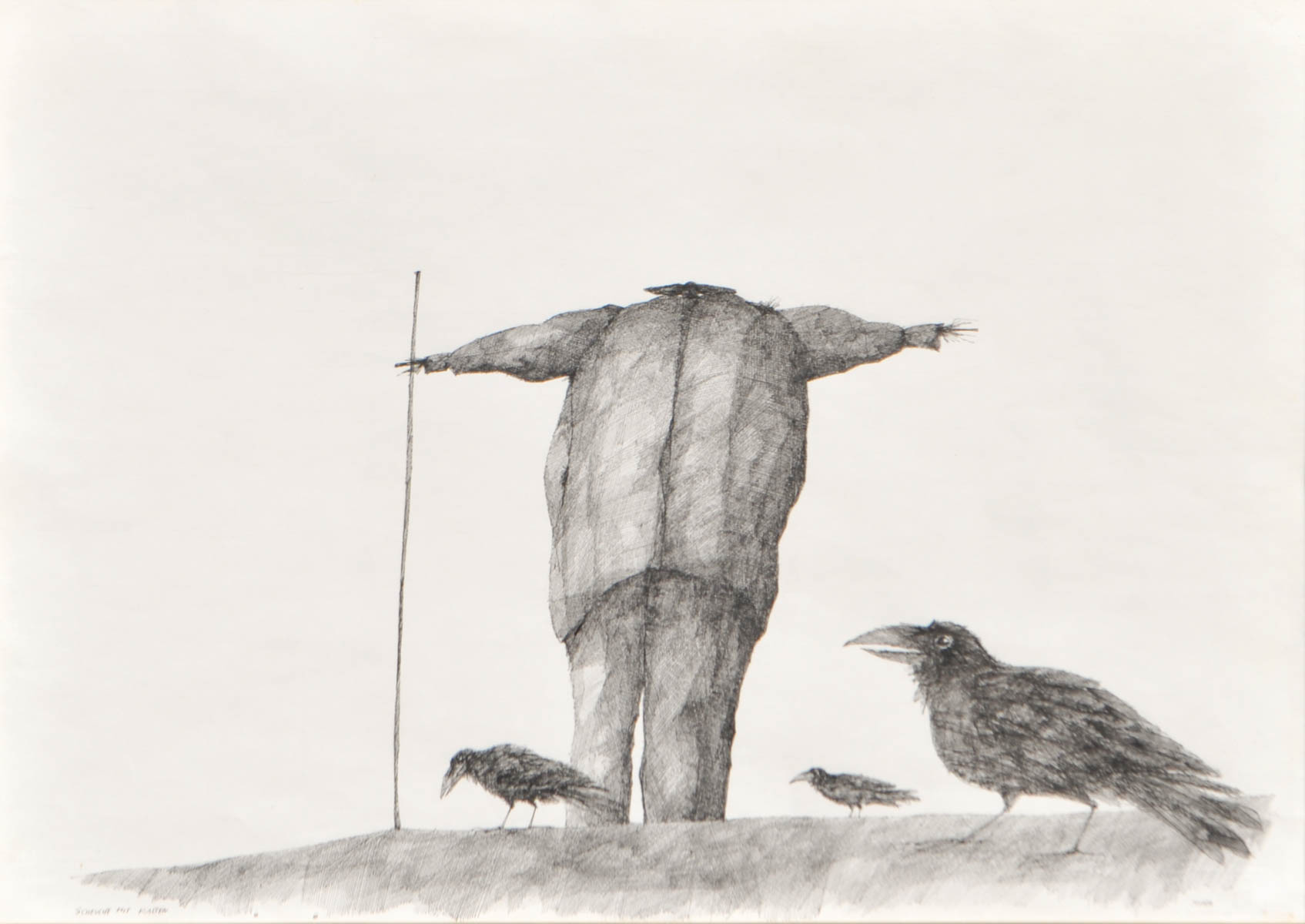 Paul Flora (Glurns/Glorenza 1922 - Innsbruck 2003) Spaventapasseri con corvi;China, 44 x 62 cm, in cornice