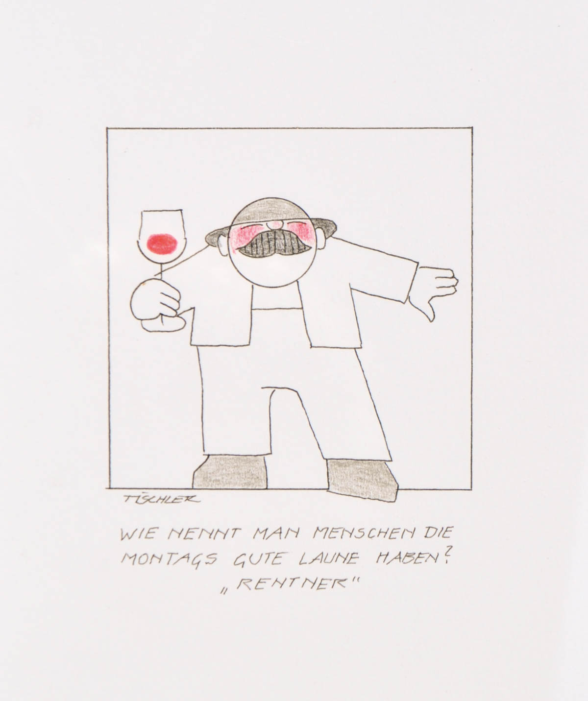 Peppi Tischler (Latsch/Laces 1942 - lebt in Meran/vive a Merano) Wie nennt man Menschen die montags gute Laune haben? "Rentner";Come si chiamano le persone che sono di buon