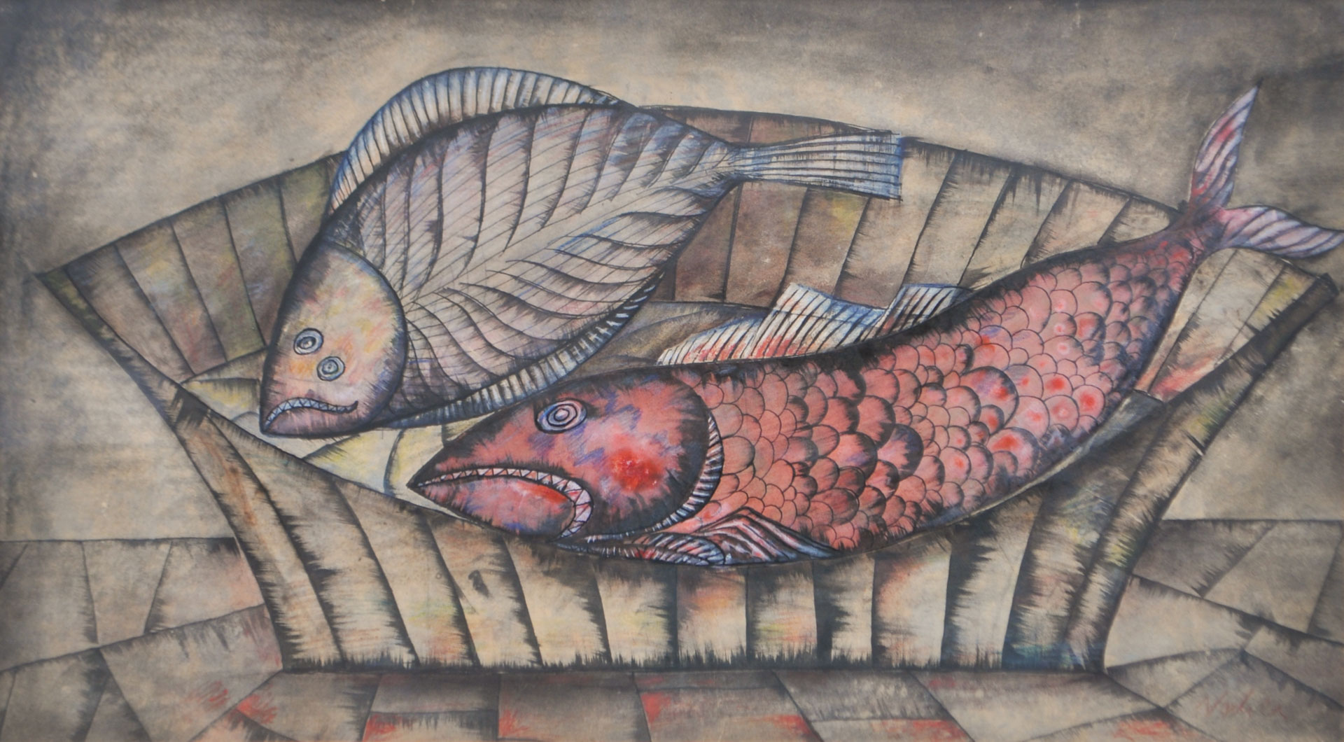 Willy Valier (Bozen/Bolzano 1920 - Senigallia 1968) Due pesci, 1960 ca.;Tecnica mista su carta, 37 x 66 cm, in cornice