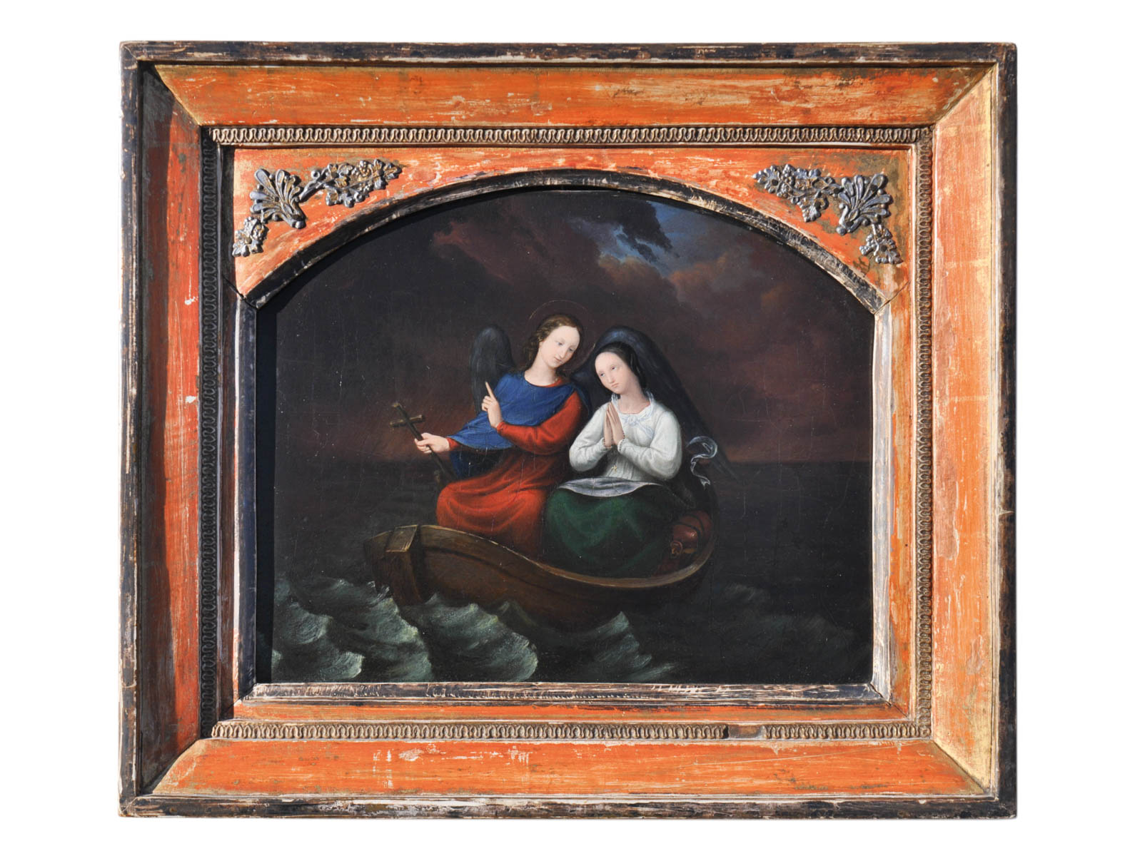 Maler der Mitte des 19. Jh./Pittore del XIX sec. Angelo custode;Olio su tavola, 20,5 x 26 cm, restauri, cornice
