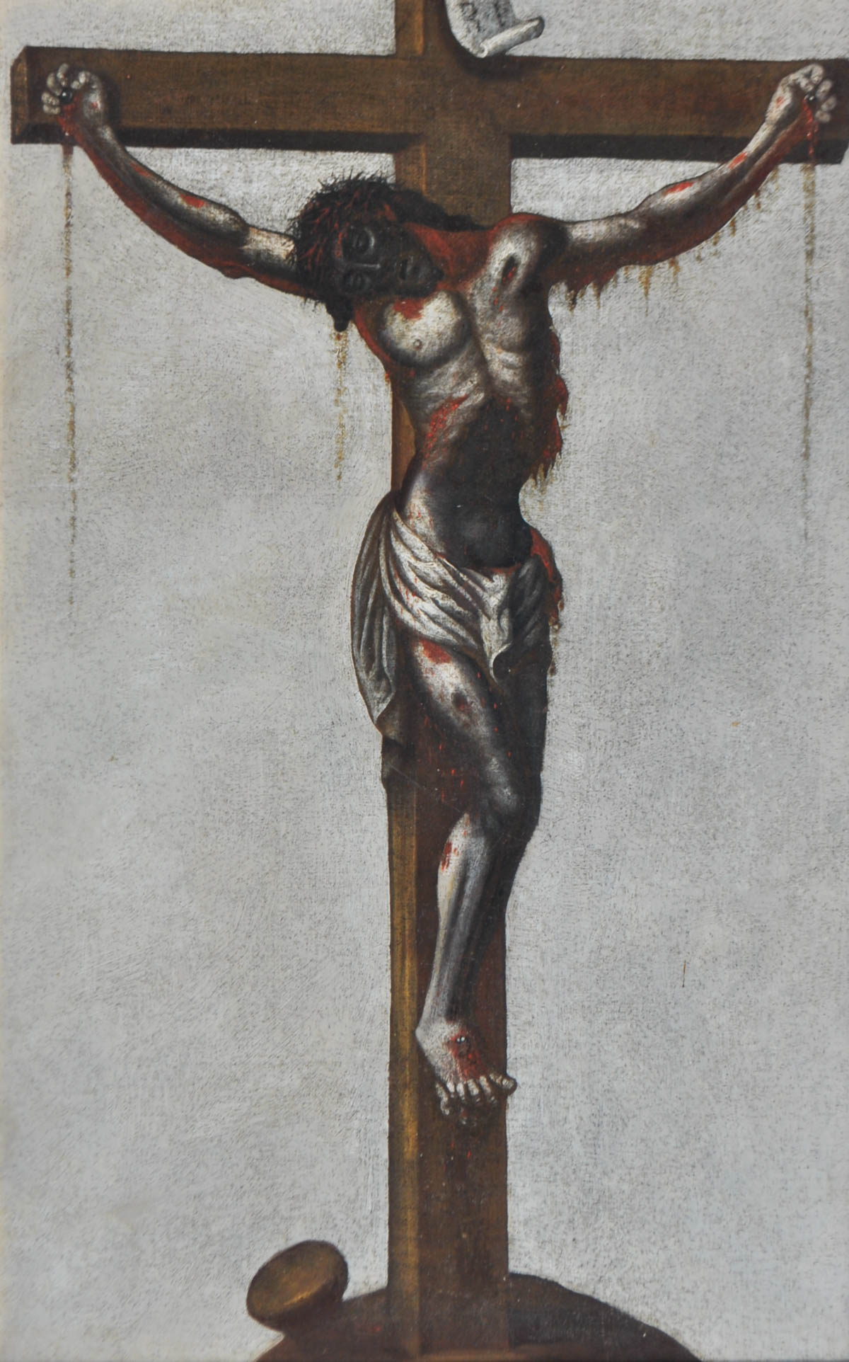 Alpenländischer Maler des 18 Jh./Pittore alpino del XVIII sec. Crocifissione;Olio su tela, 68 x 45 cm, restauri e rintelato, in cornice