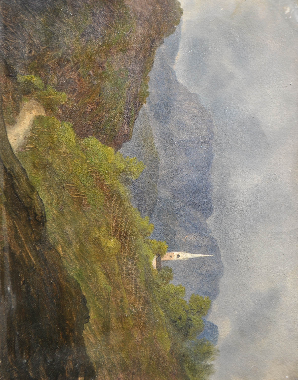 Karl Vinzenz Moser (Bozen/Bolzano 1819 - 1882) Collepietra con Sciliar, 1841;Olio su carta su cartone, 32 x 40,5 cm