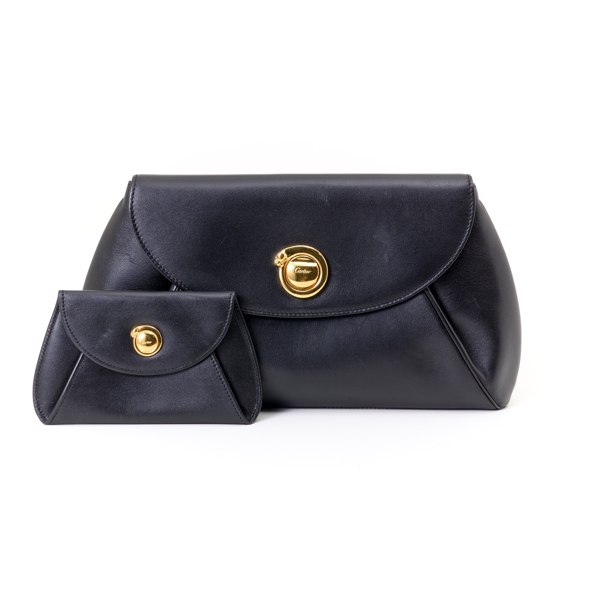 Lot consisting of Must de Cartier Panthère plain clutch and mini clutch in black leather with golden Cartier logo snap closure. Original dustbag, box and card included. Good conditions.