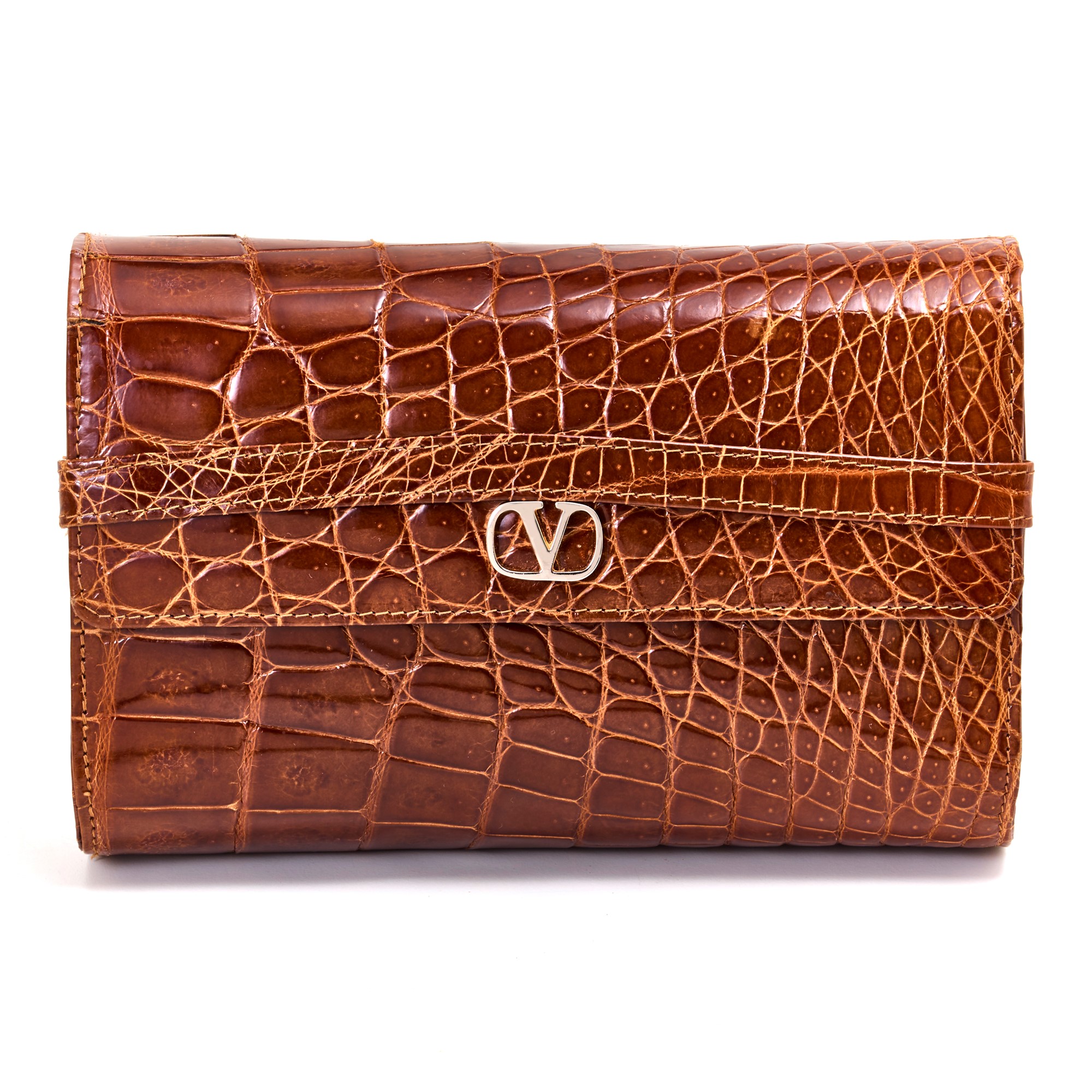 Valentino crocodile leather clutch color etrusque with silver front logo. Flap closure. Smooth eather lining color etrusque and zip pocket. Original dustbag included. Very good conditions.