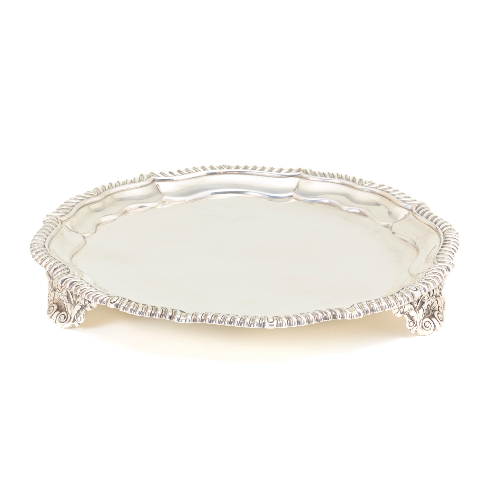 Vassoio rotondo in argento con bordo mistilineo, piedini decorati con volute. Punzoni Londra 1809.