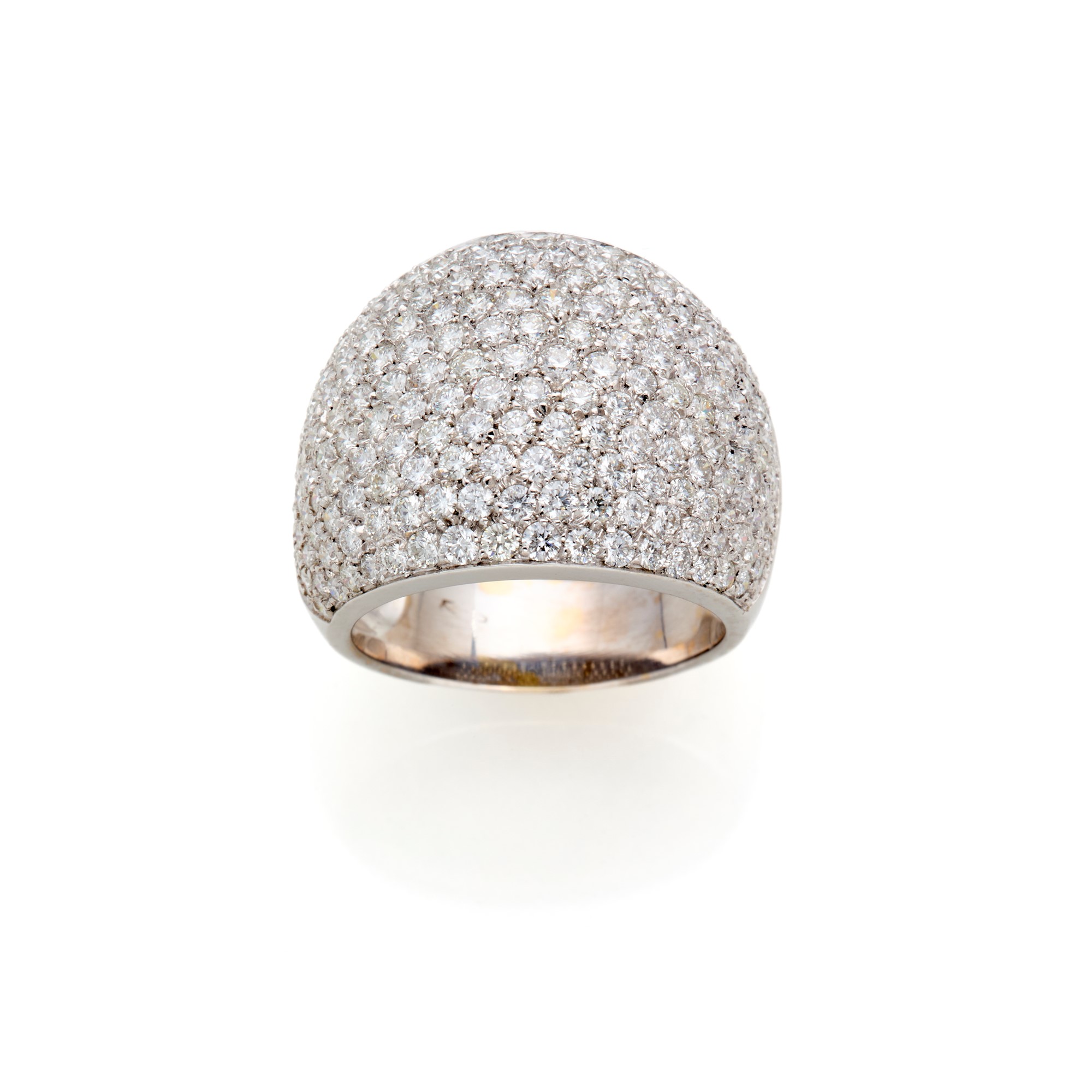 Anello a fascia in oro bianco 18 Kt rifinito con pavè di diamanti rotondi per complessivi circa 3,50 ct.