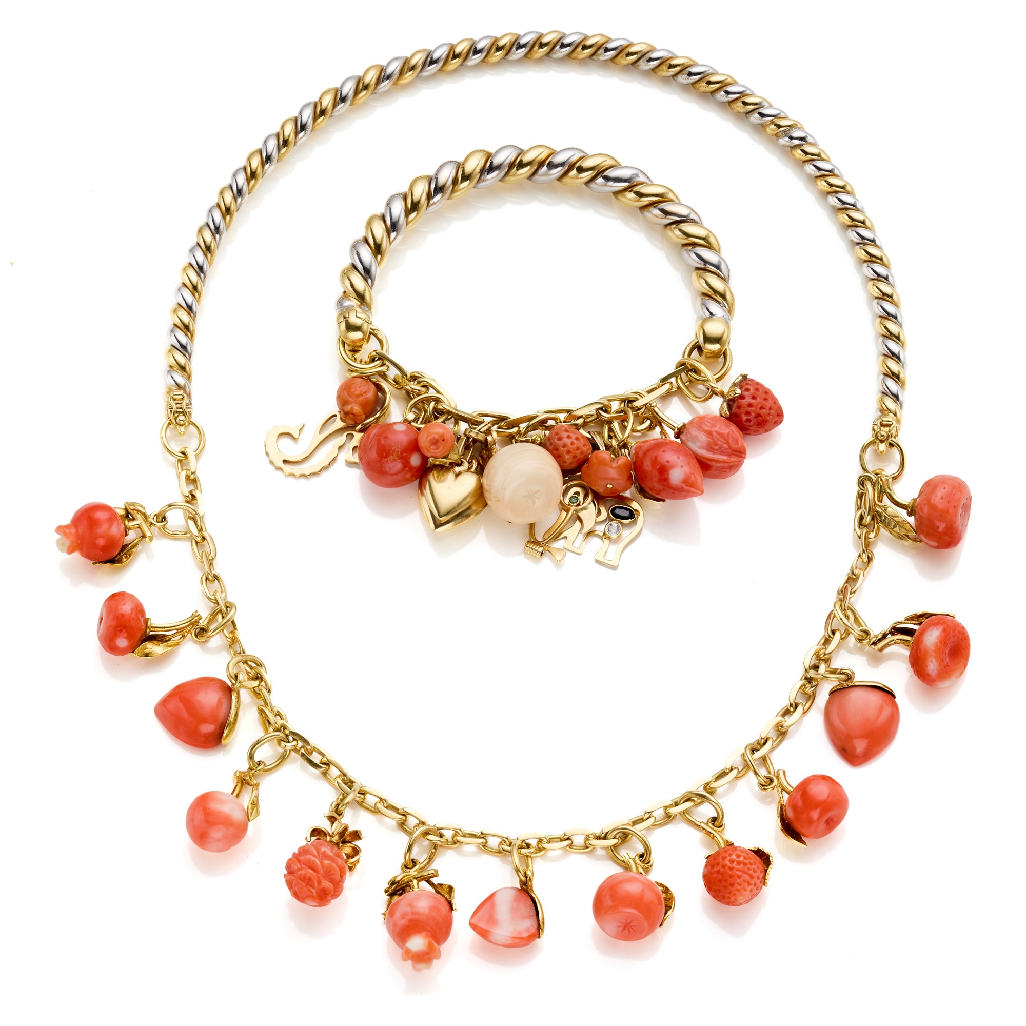 Micheletto Demi parure consisting of 18 Kt yellow and white gold semi-rigid necklace and bracelet, finished with orange coral charms.