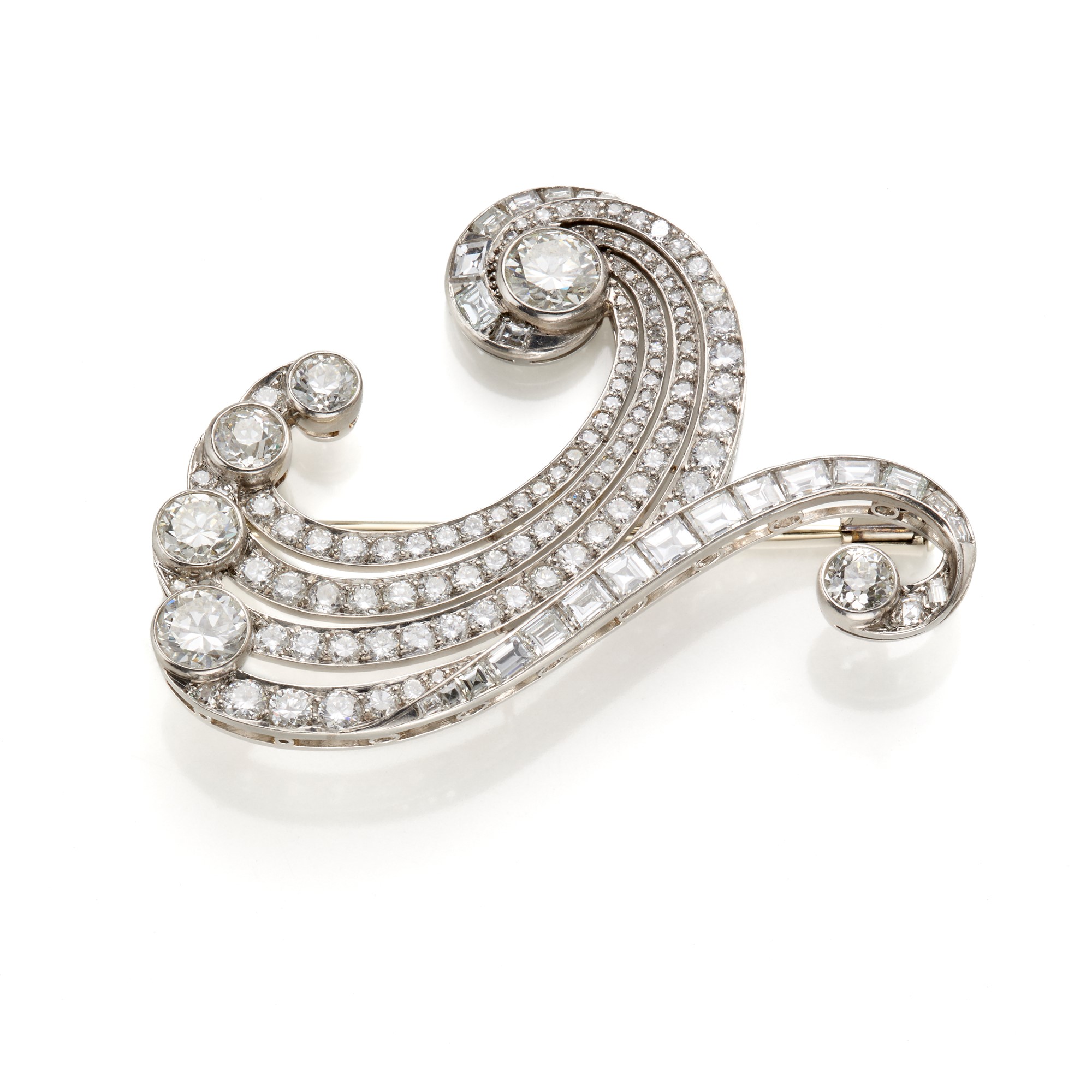 Spilla Ravasco in platino con diamanti rotondi e baguette per complessivi circa 5,30 ct, di cui il più grande di circa 0,80 ct.