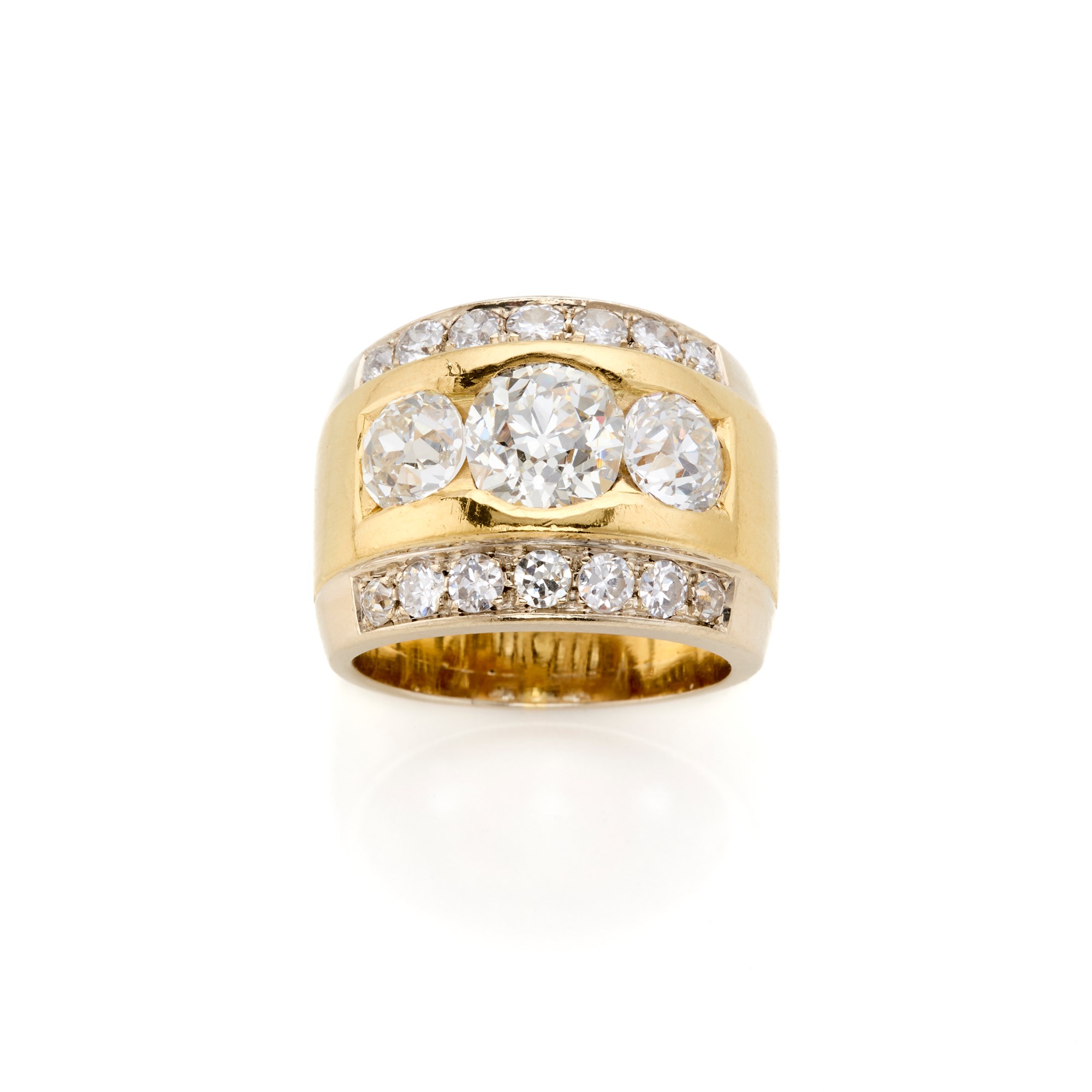 Anello a fascia in oro giallo 18 Kt con diamanti rotondi per complessivi circa 3,70ct di cui i tre centrali di circa 1,50 ct, 0,65 ct e 0,70 ct.