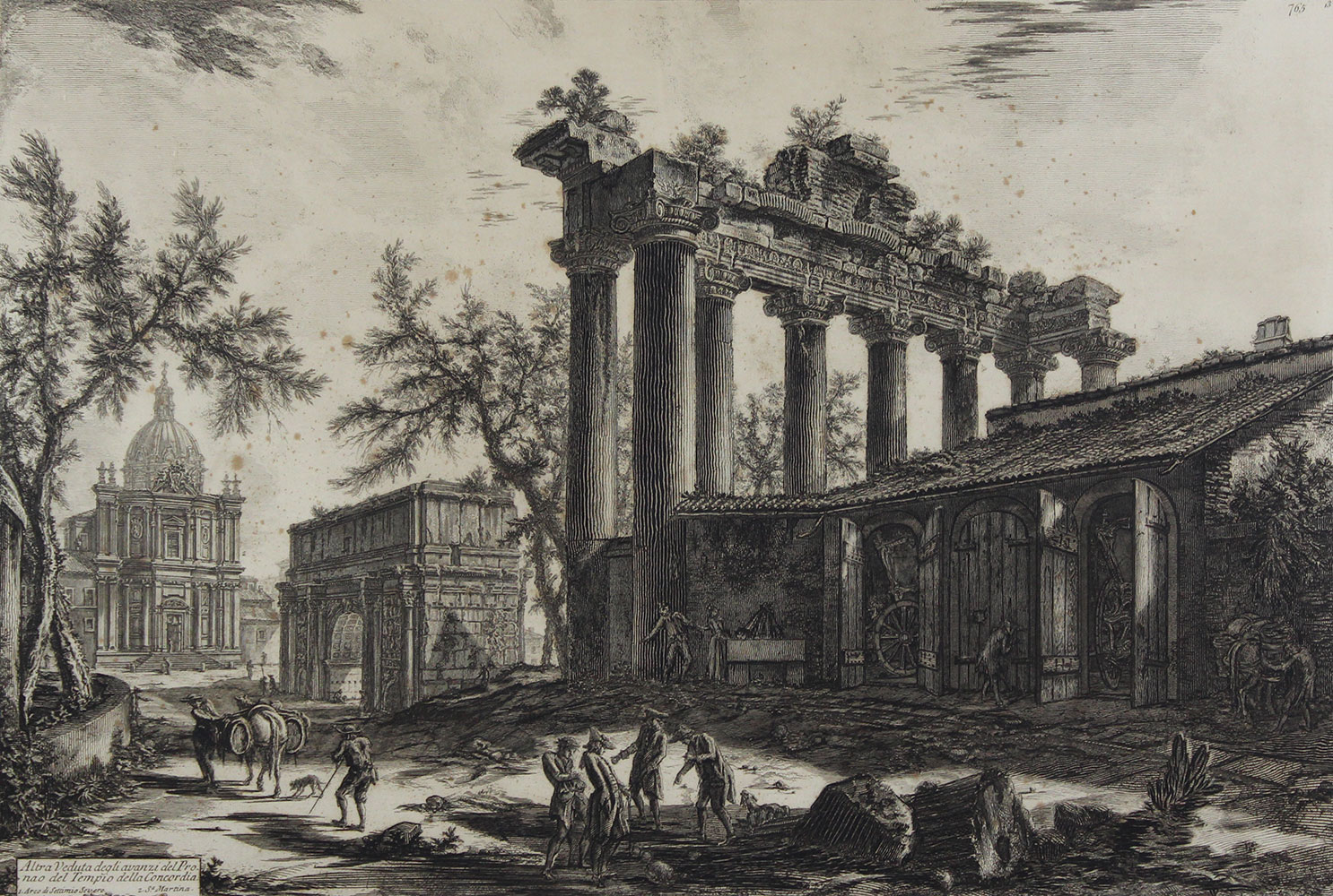 Piranesi Giovanni Battista Altra veduta degli avanzi del Pronao del Tempio della Concordia acquaforte su carta, cm. 57x83 (lastra cm. 47x71) firmata in lastra in basso a sinistra, sono presenti macchie di umidità