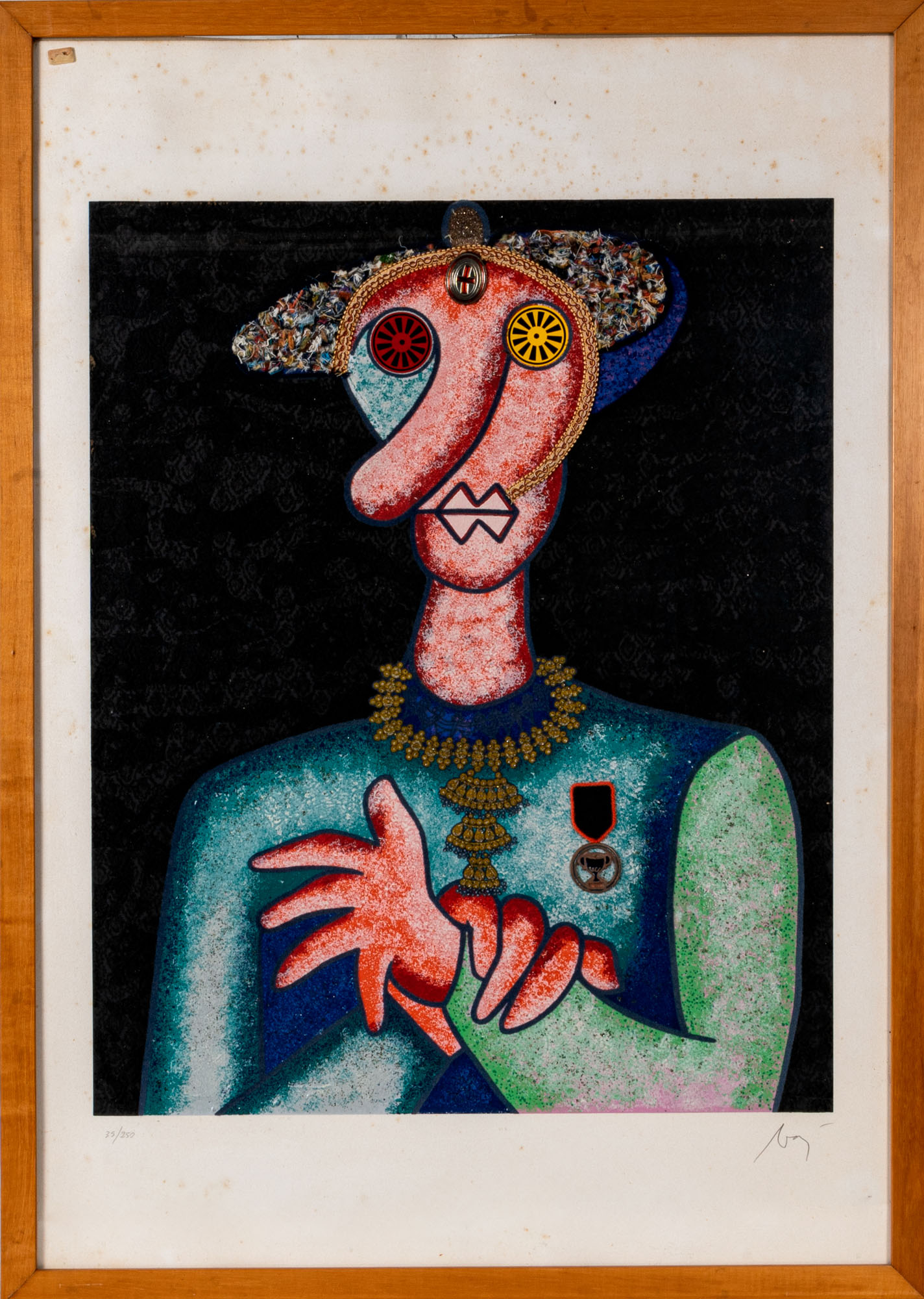 ENRICO BAJ(1924 - 2003)Senza titolo (Torero)Serigrafia con applicazioni su carta, es. 35/250100 x 70 cmFirmata a matita in basso a destra e numerata in basso a sinistraPROVENIENZA:Collezione privata, Milano