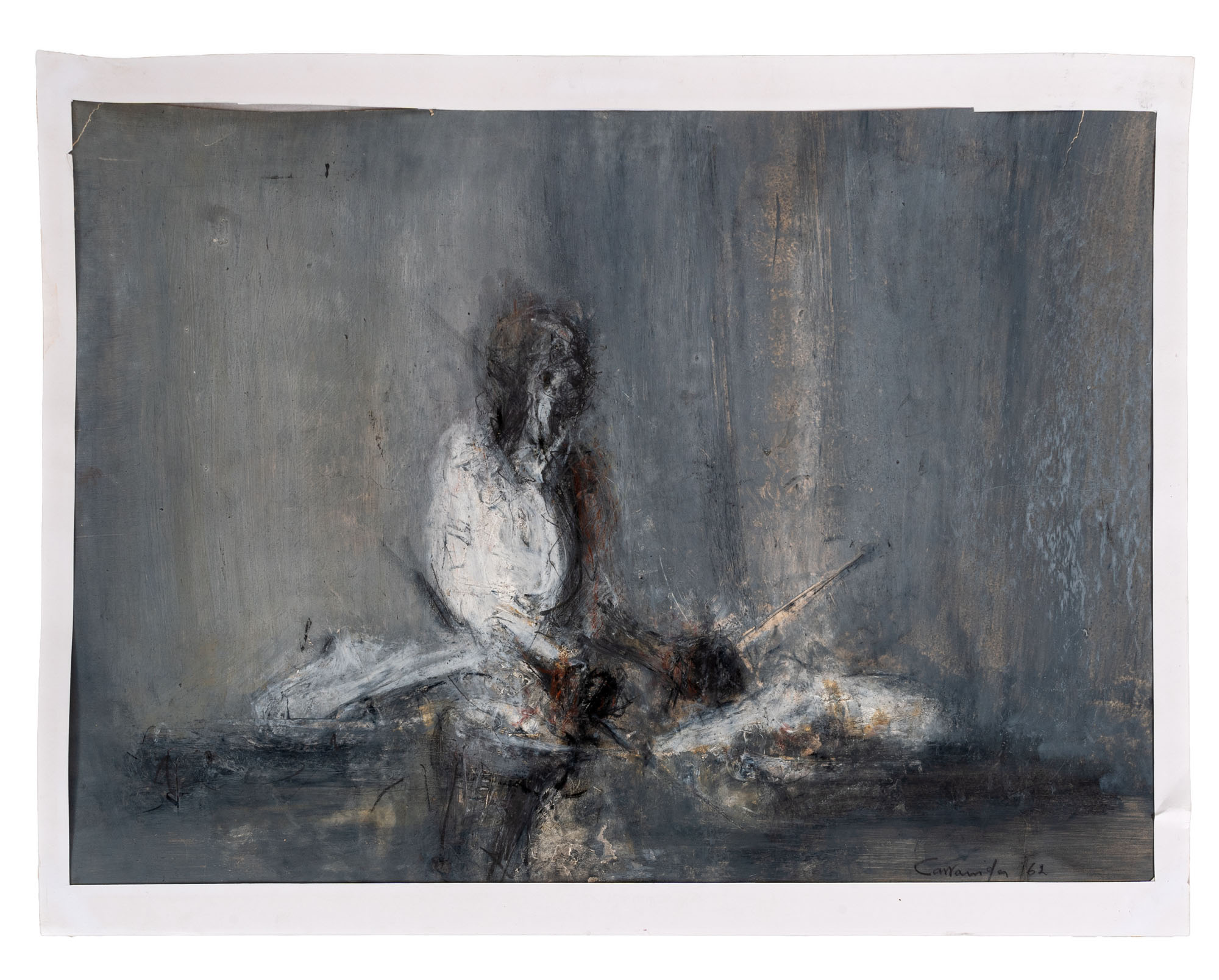 GIANCARLO CAZZANIGA(1930 - 2013)Figura1962Tecnica mista su cartoncino50 x 48 cmFirmata e datata in basso a destraPROVENIENZA:Galleria d'Arte Narciso, Torino (etichetta al retro)Collezione privata, Torino