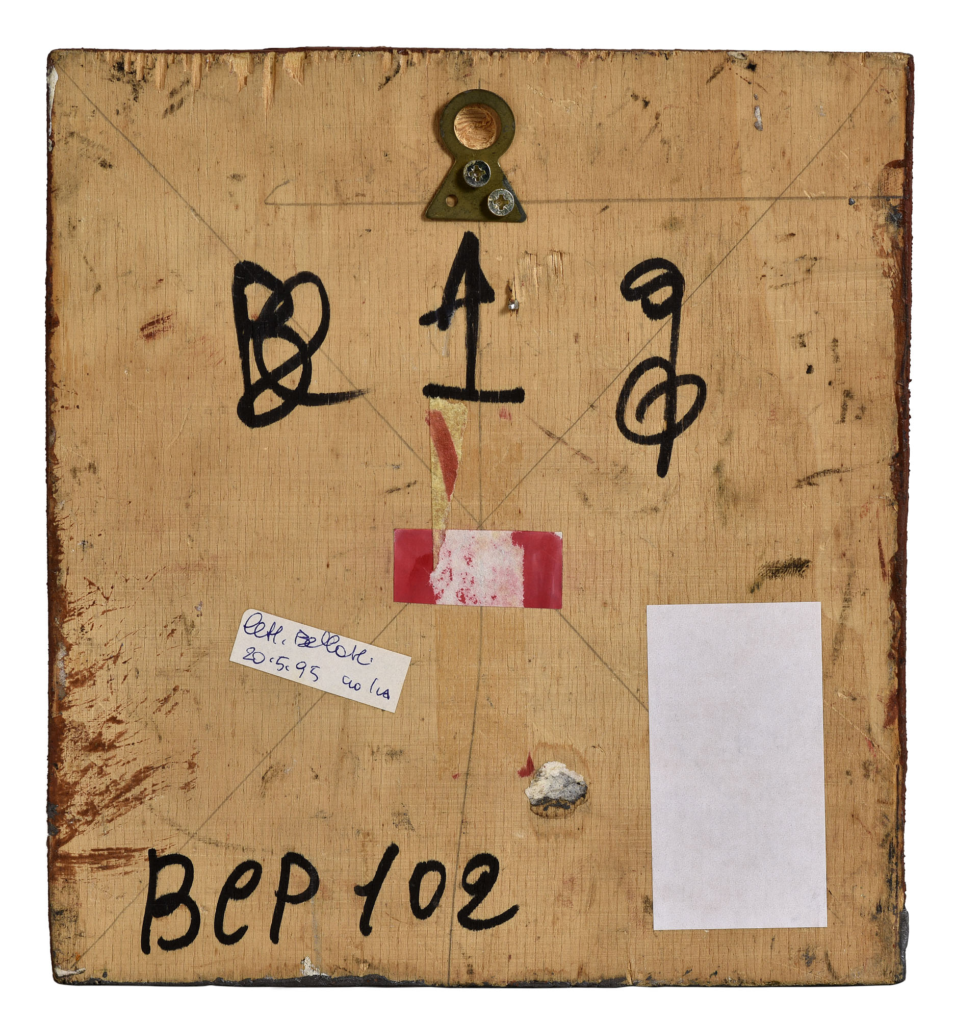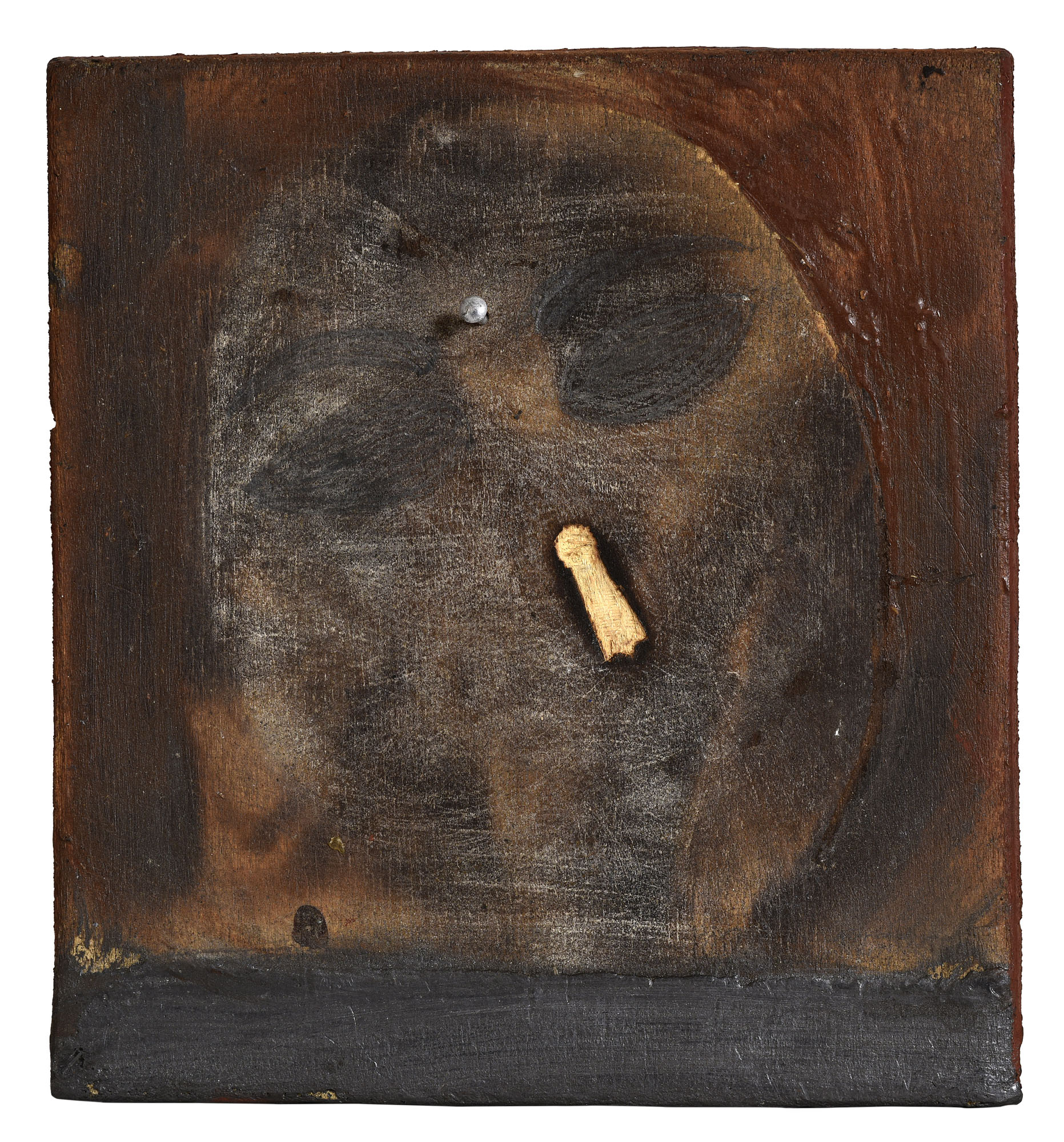 BRUNO CECCOBELLI(1952)Senza titolo1990Tecnica mista su tavola con applicazioni19,7 x 18,3 cmSigla al retroPROVENIENZA:Collezione privata, MilanoESPOSIZIONI:Aprile 1992, Abissa me, Galleria Mosaico Arte Contemporanea, Messina