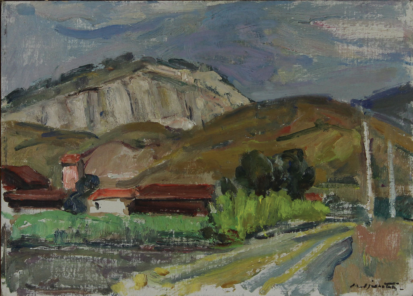 Disertori Mario Colli Euganei olio su tela, cm 25x35 firmato in basso a destra, al retro etichetta Libreria Catullo - Galleria Ghelfi Verona datata 19/9/68 e timbro Libreria e Galleria d'Arte Ghelfi Verona