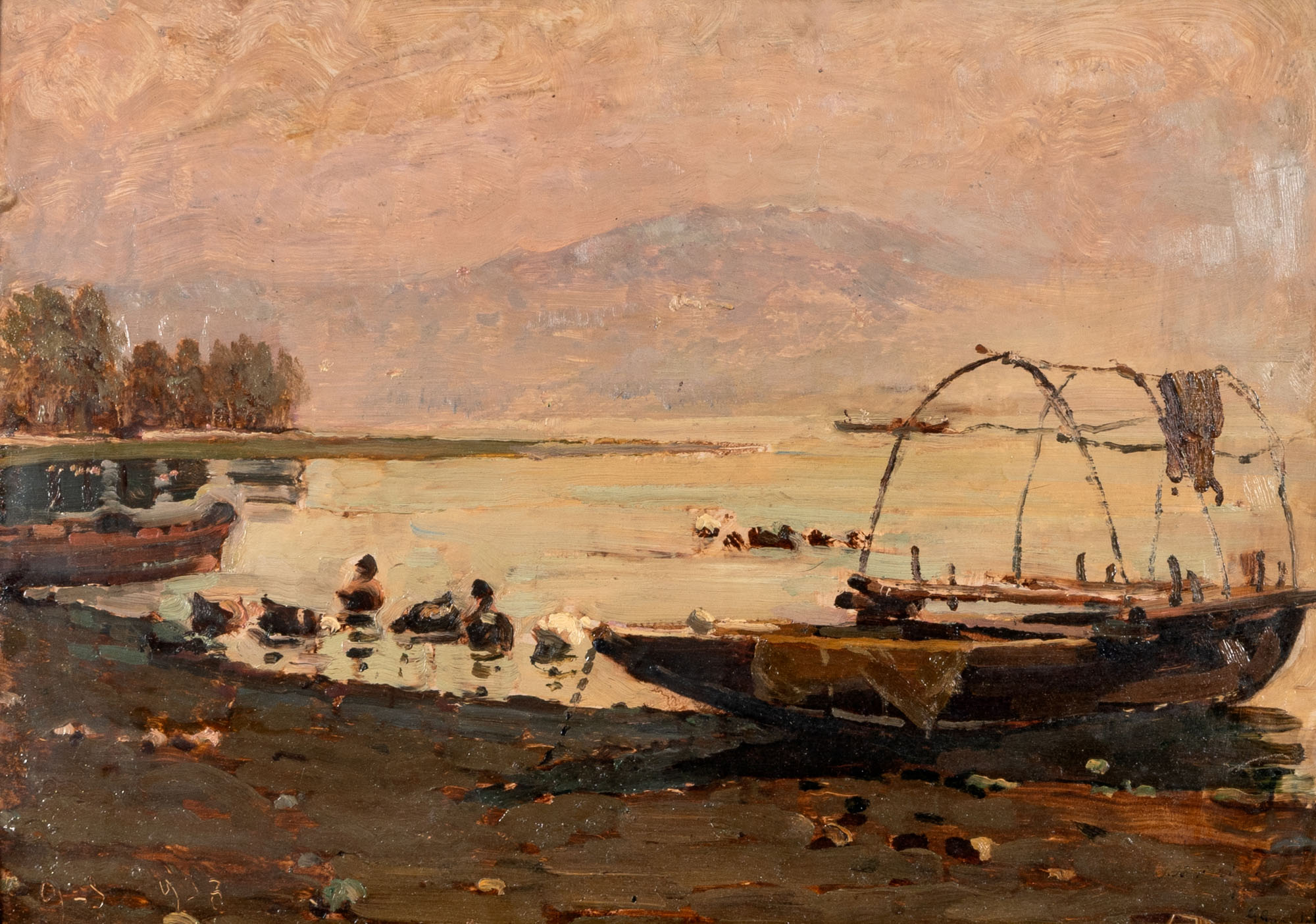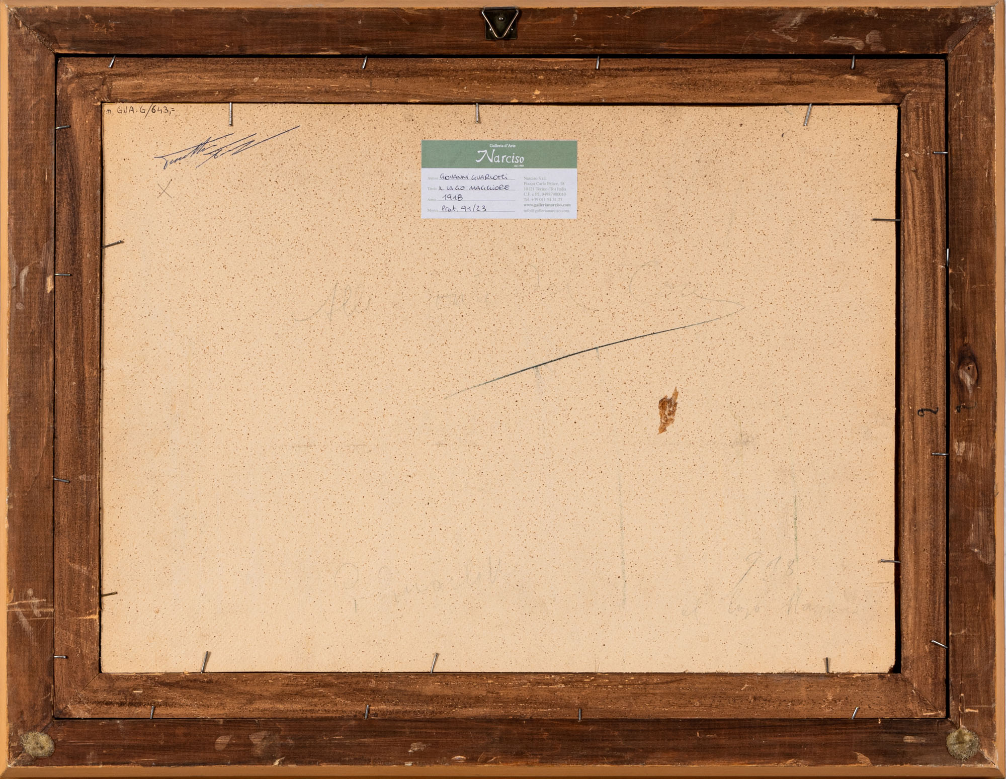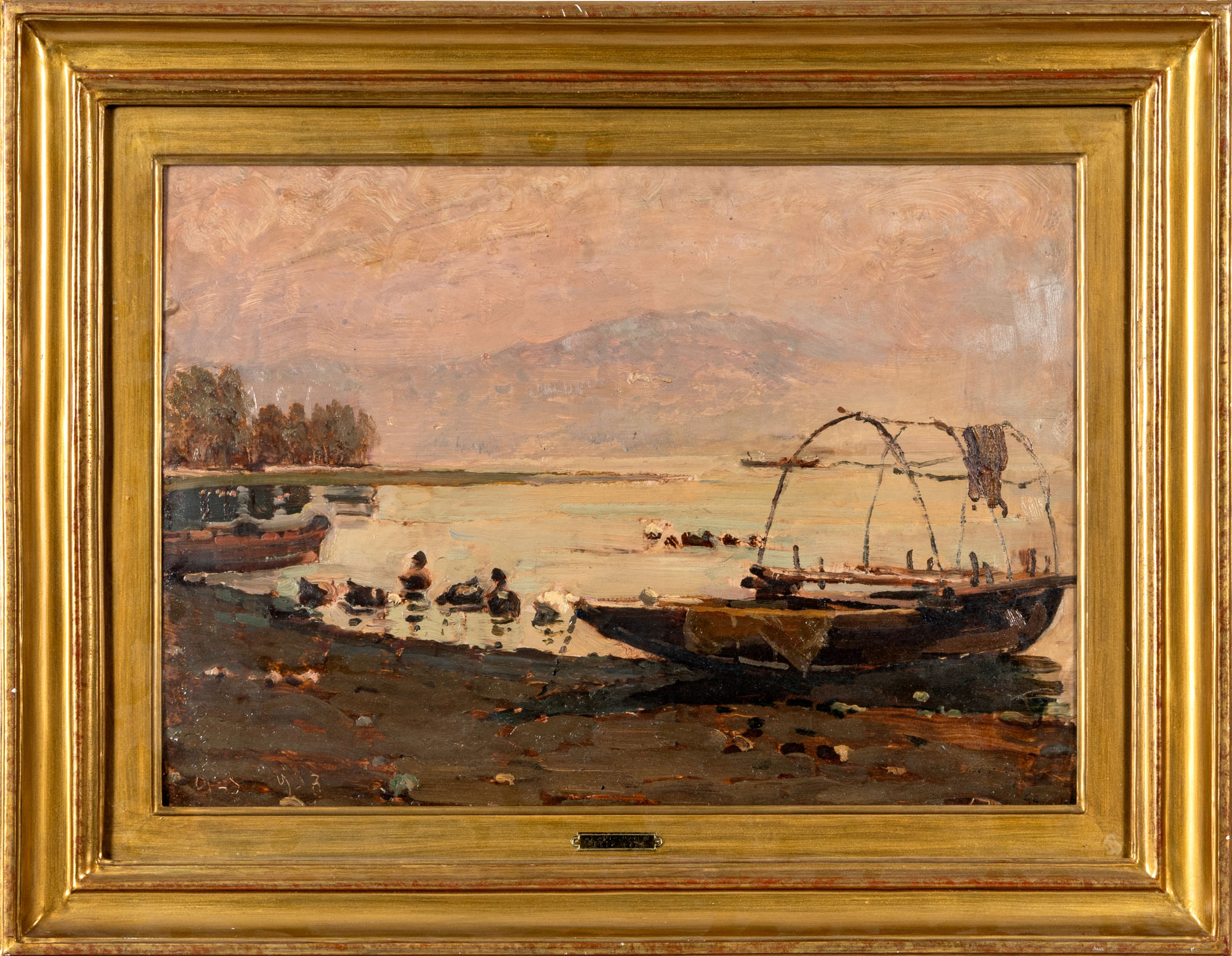GIULIO GUARLOTTI(1869 - 1954)Il lago maggiore1918Olio su cartone35 x 50 cmFirmato in basso a destra, siglato e datato in basso a sinistraPROVENIENZA:Galleria d'Arte Narciso, Torino (etichetta al retro)Collezione privata, Torino