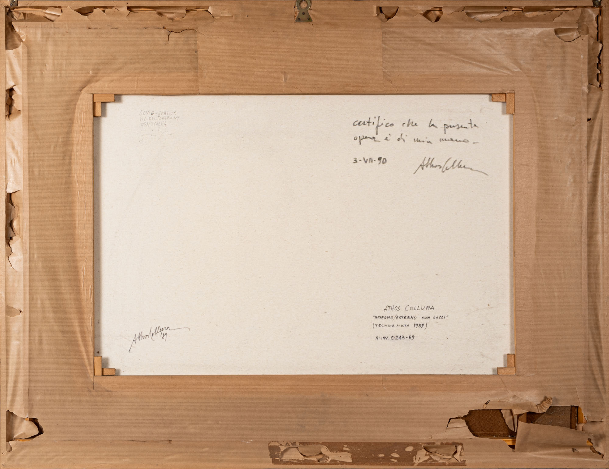 ATHOS COLLURA(1940)Interno/esterno con sassi1969Tecnica mista su carta applicata su tela70 x 100 cmFirma, data, titolo e dichiarazione di autenticità firmata dall'artista al retroPROVENIENZA:Collezione privata, ModenaESPOSIZIONI:17 novembre - 9 dicembre 1990, Athos Collura, Rocca Medievale, Comune di VignolaBIBLIOGRAFIA:G. Segato, Athos Collura, catalogo della mostra tenutasi presso la Rocca Medievale, Comune di Vignola, Edizioni ADAC, 1990, s.p.(ill.)