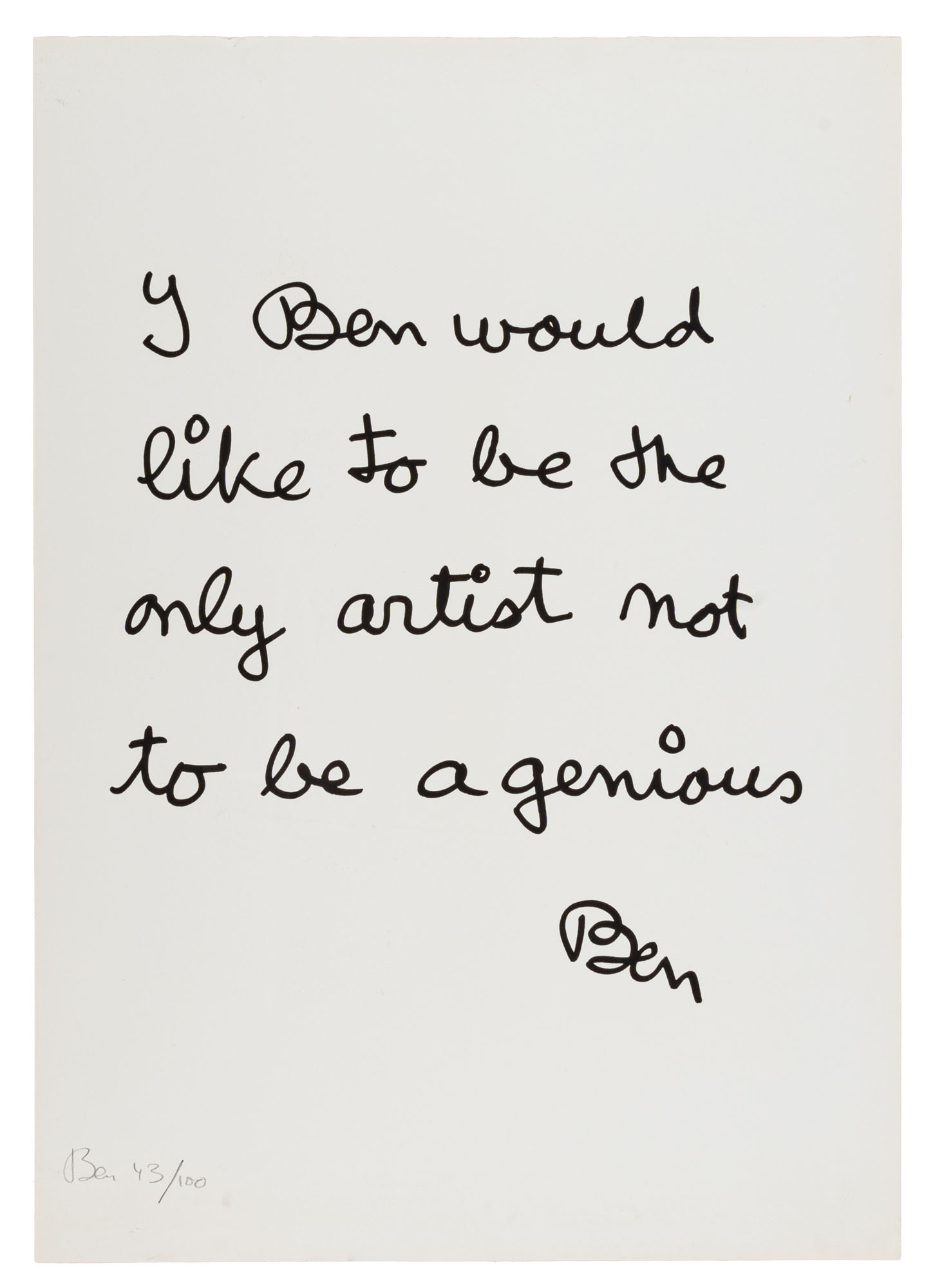 BEN VAUTIER(1935)I Ben would like to be the only artist not be a geniousSerigrafia, es. 43/10070 x 49,5 cmFirmata e numerata a matita in basso a sinistraPROVENIENZA:Collezione privata, Milano