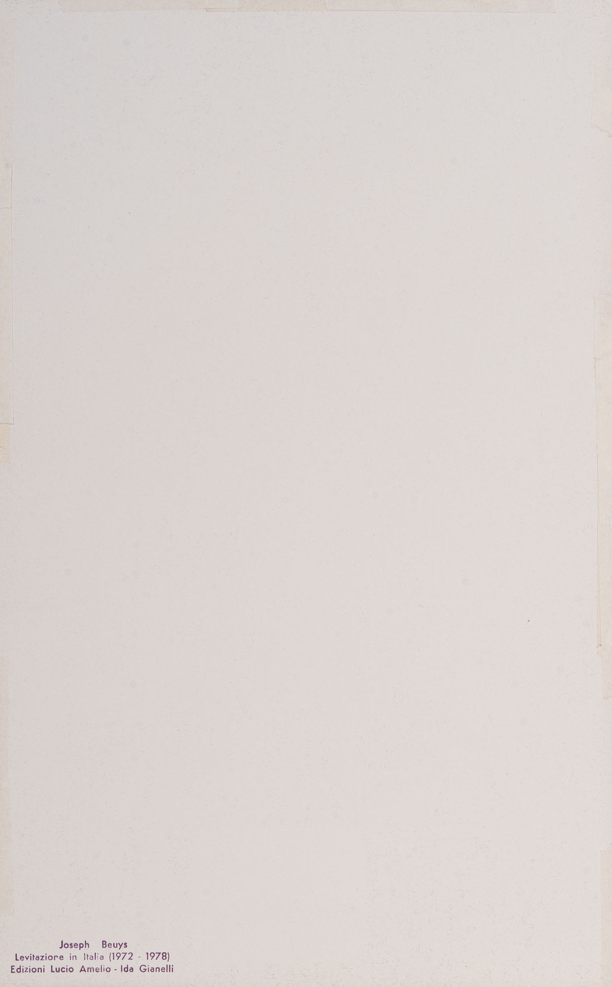 JOSEPH BEUYS(1921 - 1986)Levitazione in Italia1972 - 1978Litografia, es. 88/200, Edizioni Lucio Amelio, Napoli - Ida Gianelli (timbro al retro)37 x 23 cmFirmata e numerata a matita in basso al centroPROVENIENZA:Collezione privataBIBLIOGRAFIA:J. Schellmann, 'Joseph Beuys: the multiples', Edition Schellmann, Monaco - New York, 2006, p. 222AA.VV., 'Joseph Beuys. Polentransport 1981', Mazzotta Editore, 1993