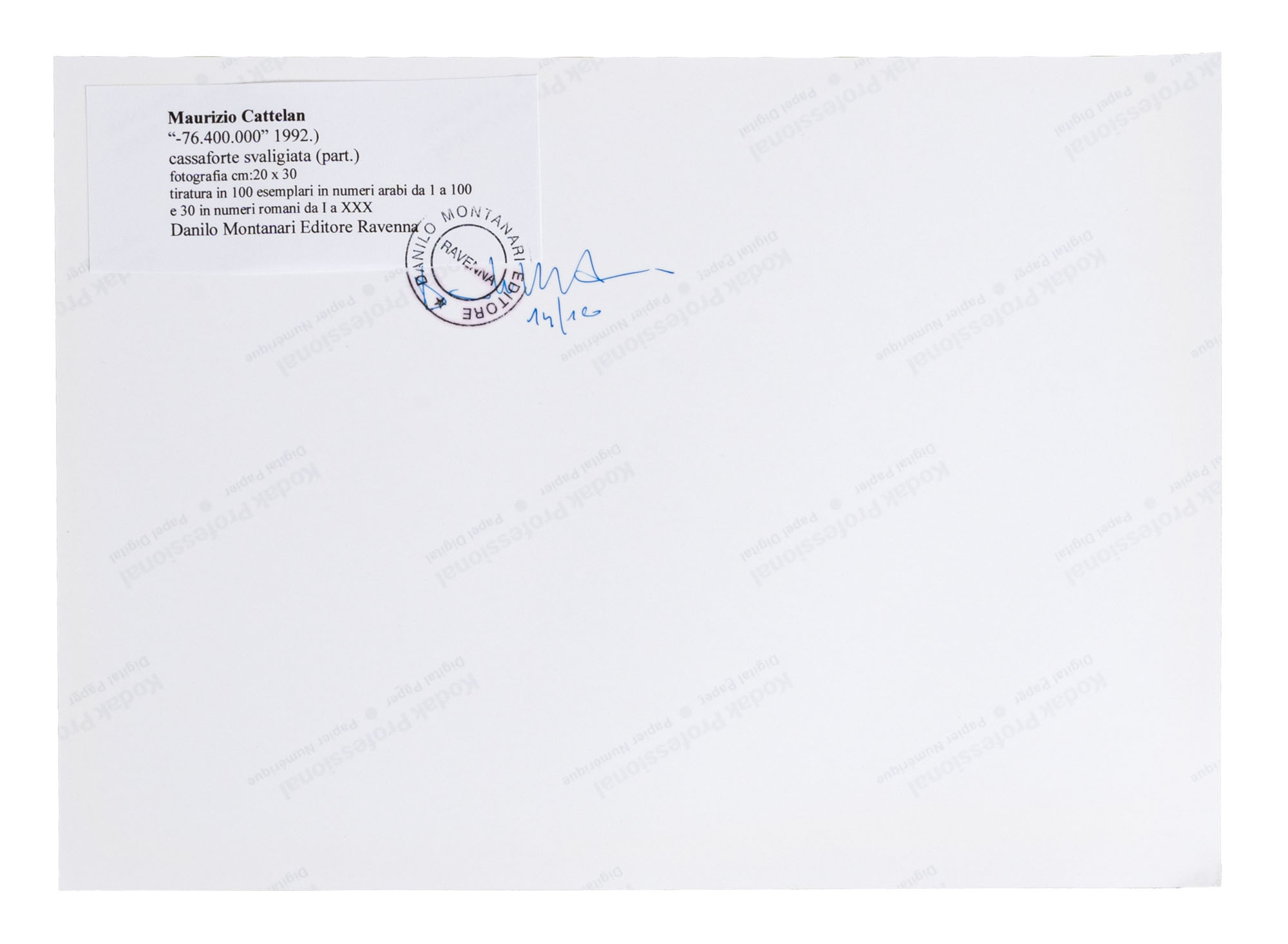 MAURIZIO CATTELAN(1960)Cassaforte svaligiata (part.) - 76.400.0001992Cartella contenente una stampa cibachrome, ed. 14/100 su una tiratura complessiva di 100 esemplari in numeri arabi e 30 in numeri romani, Danilo Montanari Editore, RavennaDimensioni della cartella: 32 x 22 cmDimensioni della stampa cibachrome: 20 x 27,8 cmTimbro e firma Danilo Montanari Editore e numerazione al retro della stampa cibachromePROVENIENZA:Collezione privata, Milano