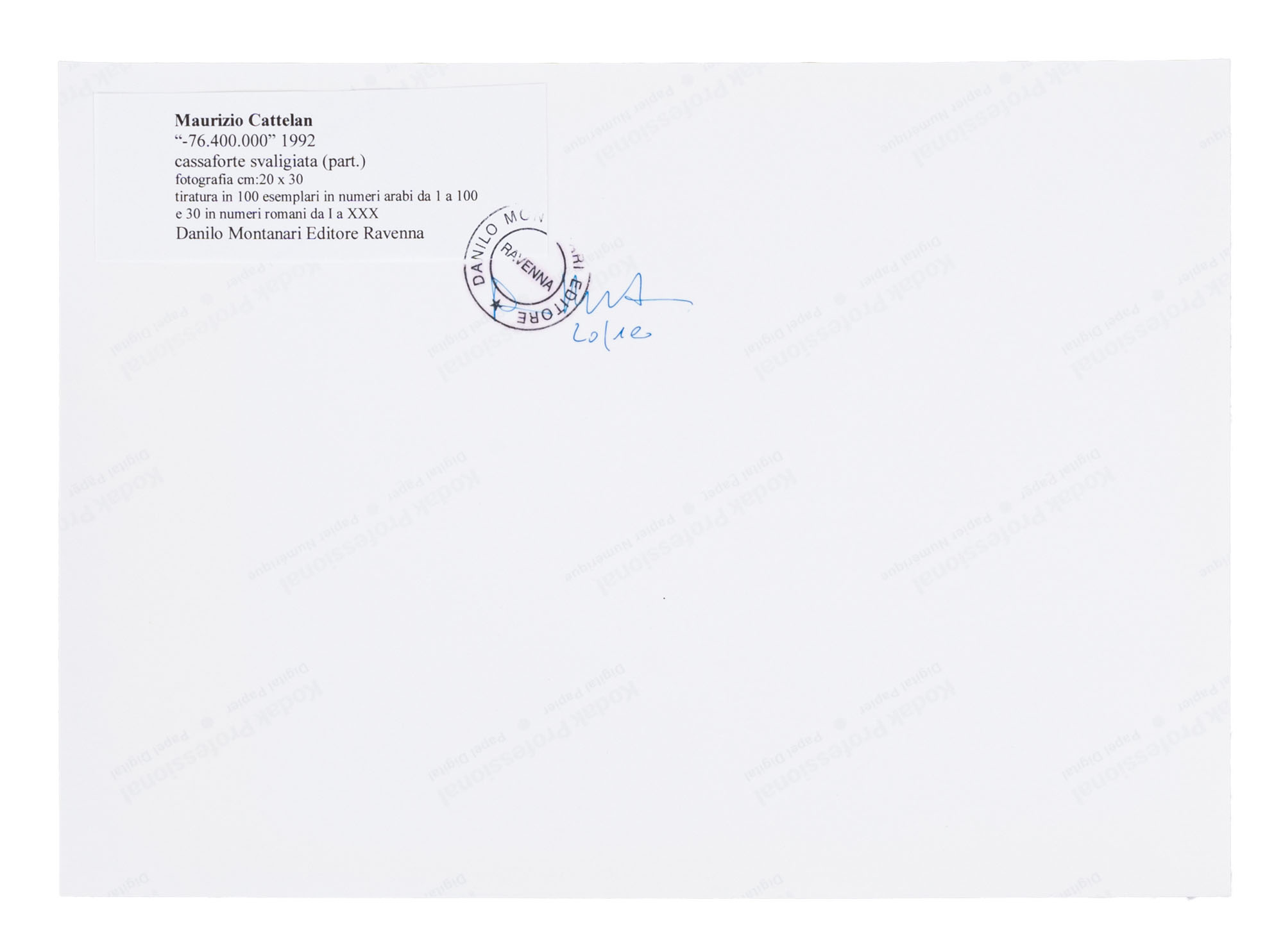 MAURIZIO CATTELAN(1960)Cassaforte svaligiata (part.) - 76.400.0001992Cartella contenente una stampa cibachrome, ed. 20/100 su una tiratura complessiva di 100 esemplari in numeri arabi e 30 in numeri romani, Danilo Montanari Editore, RavennaDimensioni della cartella: 32 x 22 cmDimensioni della stampa cibachrome: 20 x 27,8 cmTimbro e firma Danilo Montanari Editore e numerazione al retro della stampa cibachromePROVENIENZA:Collezione privata, Milano