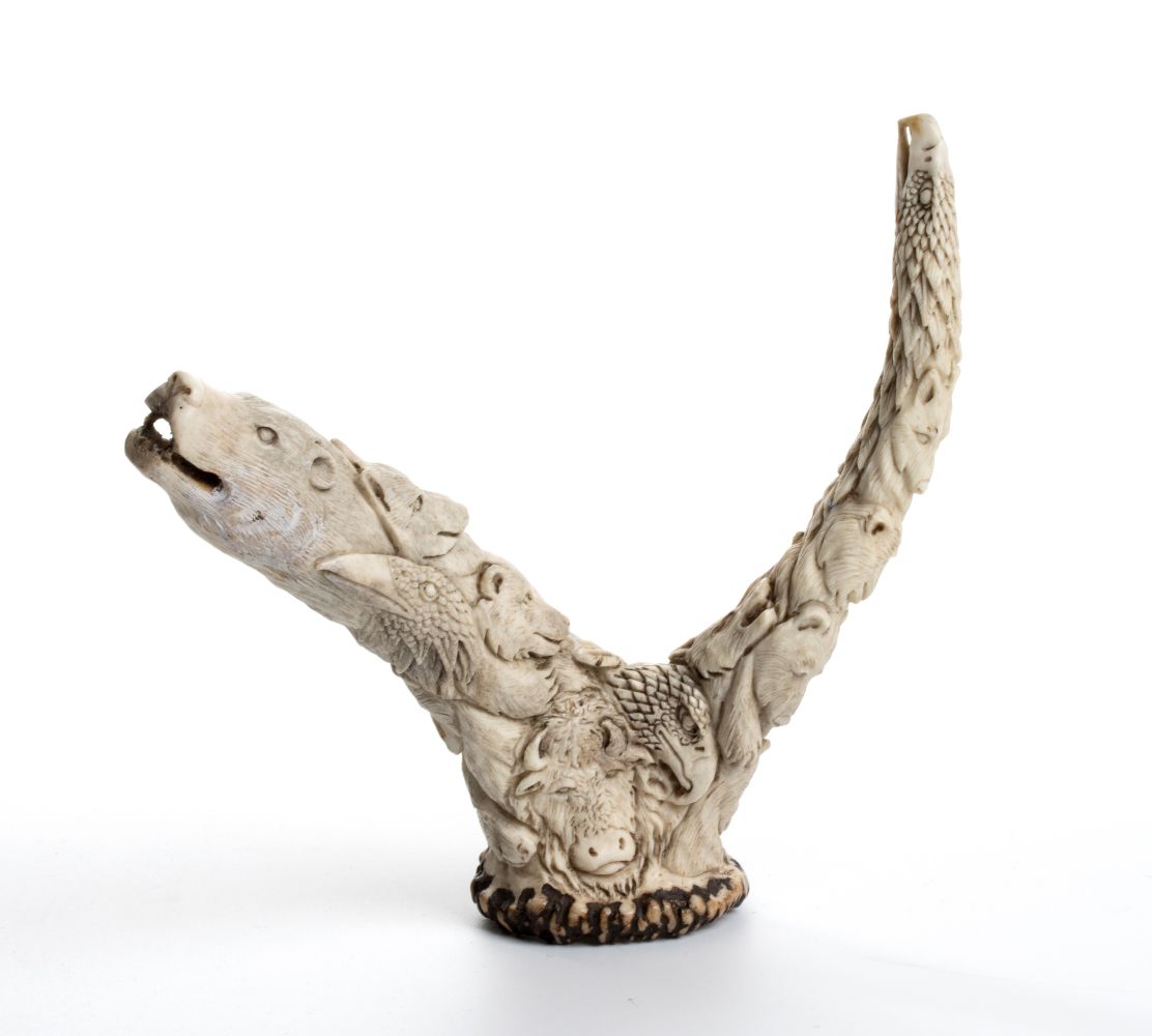 In corno di cervo nobile (Cervus elaphus Linnaeus, 1758) scolpito a raffigurare una testa di pellerossa da numerose teste di animali, Lupi, bue, rapaci, cavalli orso, etc.