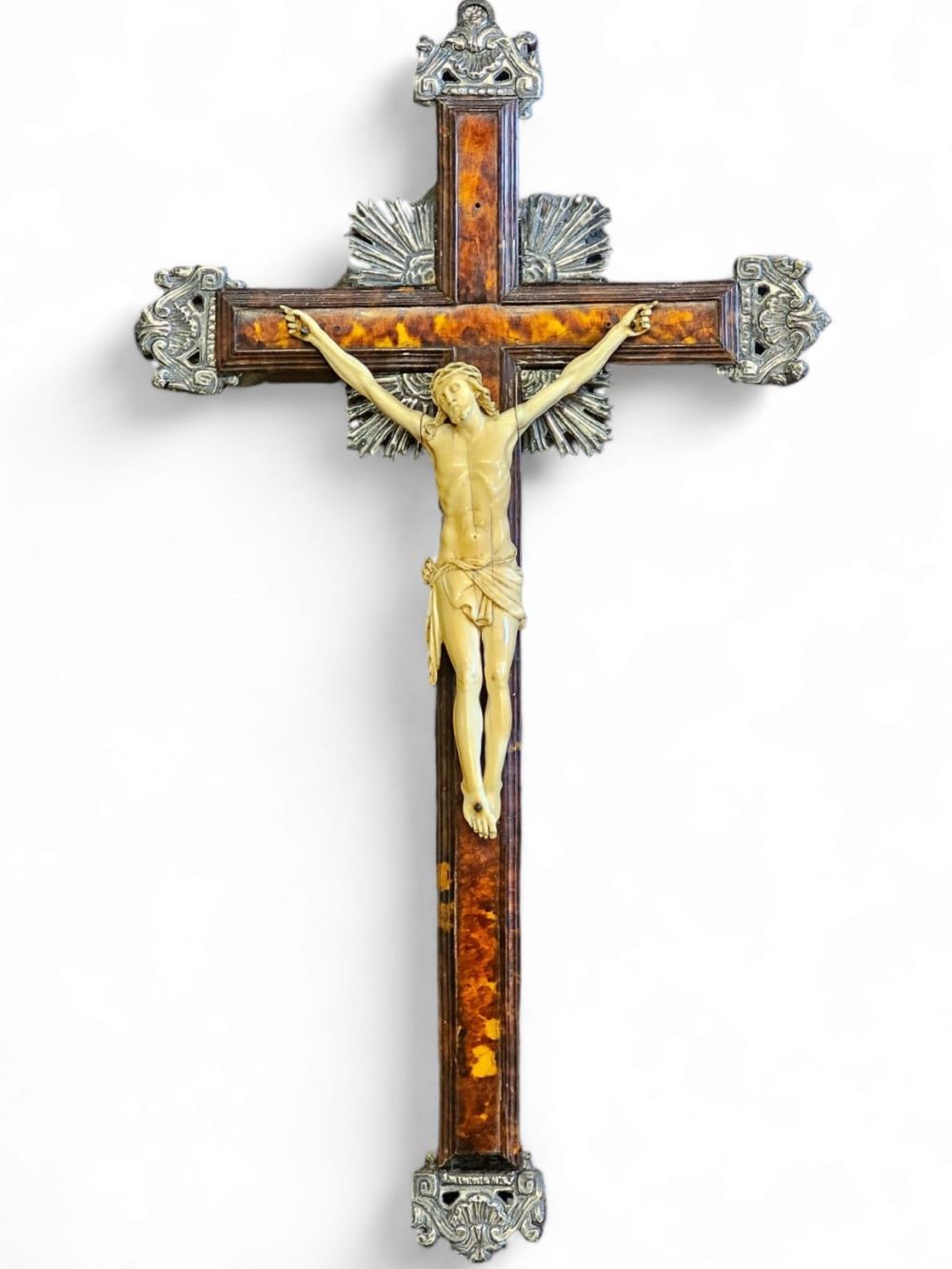 Crocifisso italiano in avorio di elefante su croce in tartaruga e argento Sicilia, XVIII secolo