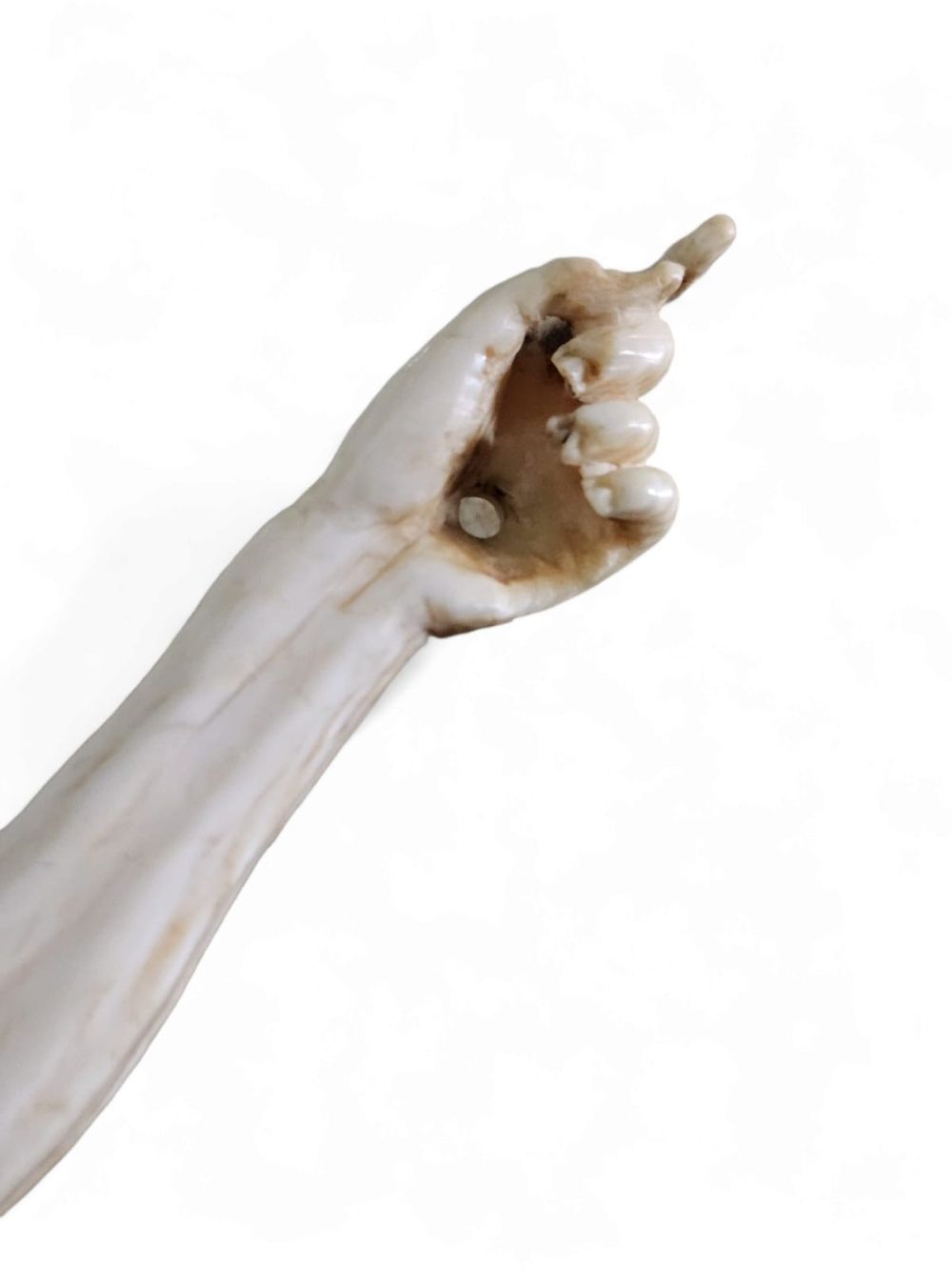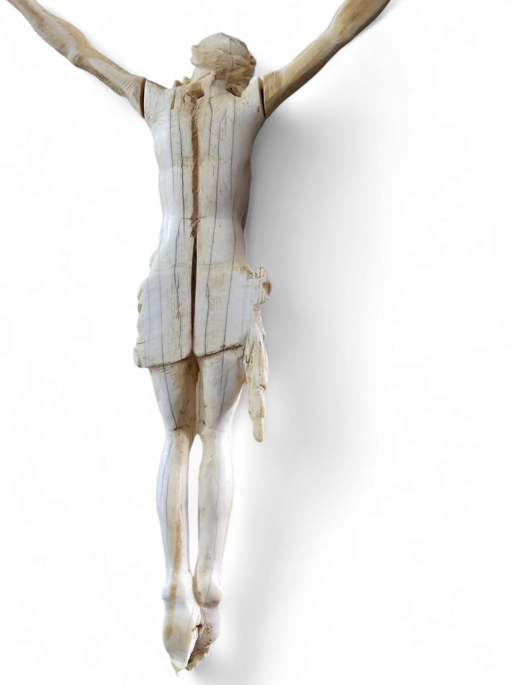 Corpus Christi in avorio di elefante scolpito (Elephas maximus Linnaeus, 1758 or Loxodonta africana Blumenbach, 1797), posto su una croce lignea lastronata in tartaruga (hawksbill sea turtle, Eretmochelys imbricata, Cheloniidae) con capocroce in argento sbalzato e cesellato. La figura del Salvatore è studiata anatomicamente; le mani sono leggermente socchiuse e i fori per i chiodi si trovano più vicini al polso e non al centro della mano. La testa presenta la corona di spine ed è ripiegata verso la spalla destra, rivolta verso l’alto; la morbida capigliatura ricade sulle spalle, gli occhi sono aperti e rivolti al cielo e la bocca è socchiusa. Le gambe del Crocifisso sono posizionate in modo parallelo, i piedi sono sovrapposti e inchiodati congiuntamente. Le parti intime sono coperte da un perizoma con drappo laterale.