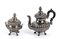 corpo piriforme su zampe ad artiglio, decorate con baccellature ed elementi a "cocciolette", coperchi con fastigi a pigna, manico in legno. Punzonate con il marchio in uso alla corporazione degli orefici di Napoli per l'argento al titolo di 833/1000, 1832-1872, argentiere Gennaro Pane (Rif. Elio e Corrado Catello, argenti napoletani pag. 145).
