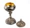 base sagomata a decori vegetali, coppa liscia con interno dorato e ricco sottocoppa con volute fogliate. Punzonata con la il marchio della "bulla" di Palermo raffigurata da un aquila a volo alto in uso a partire dal XVIII secolo, argentiere e console non identificati.