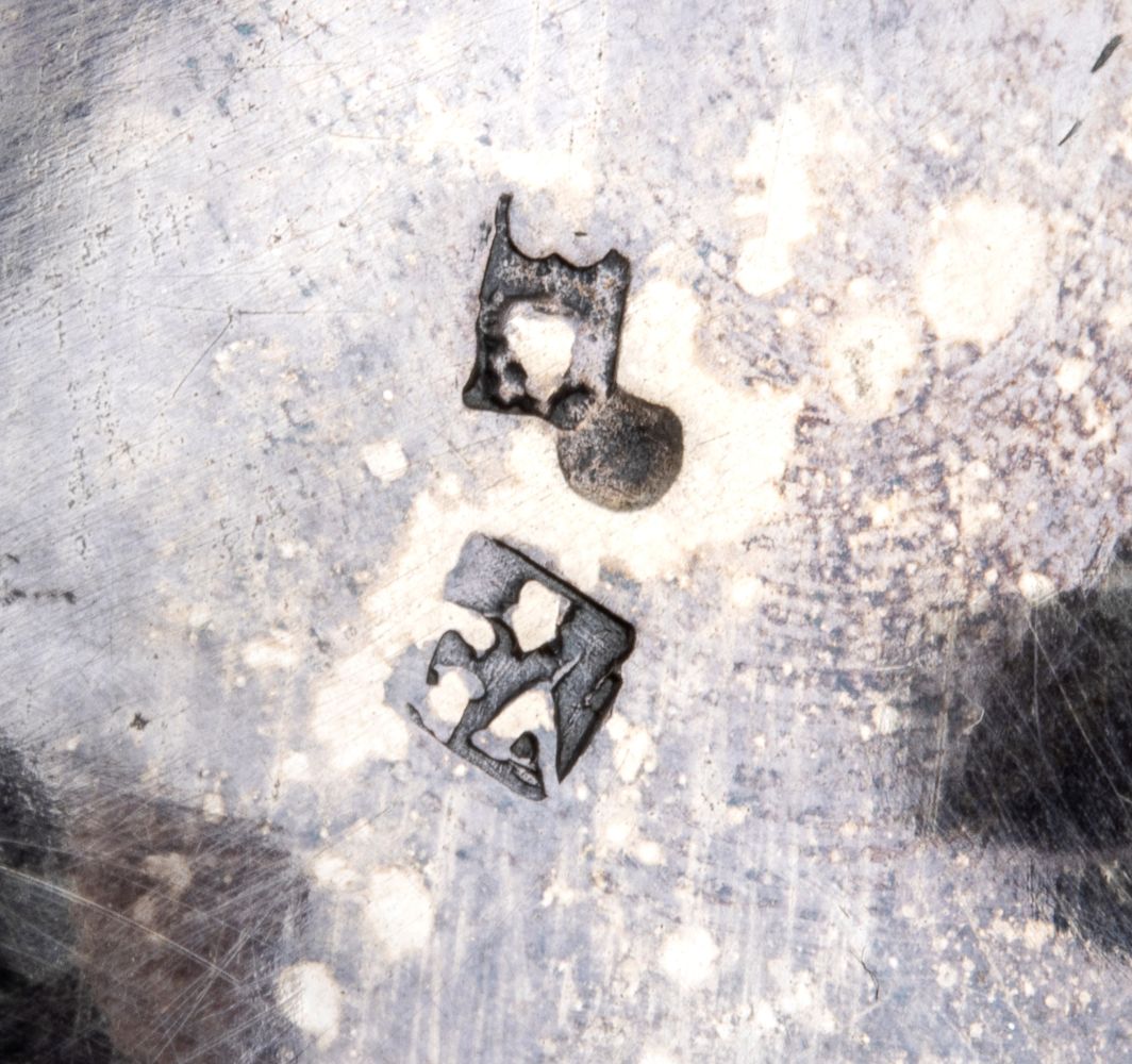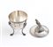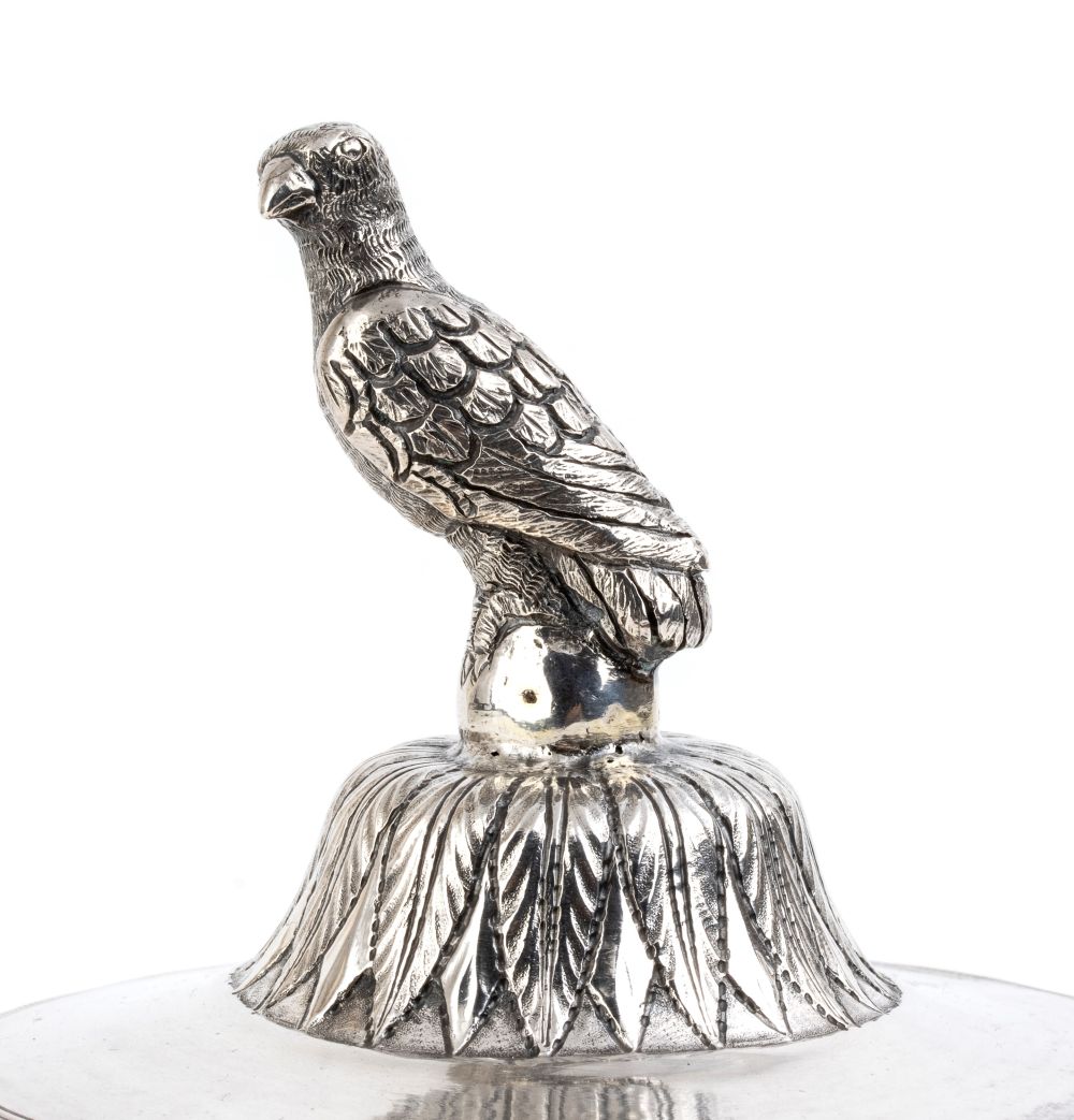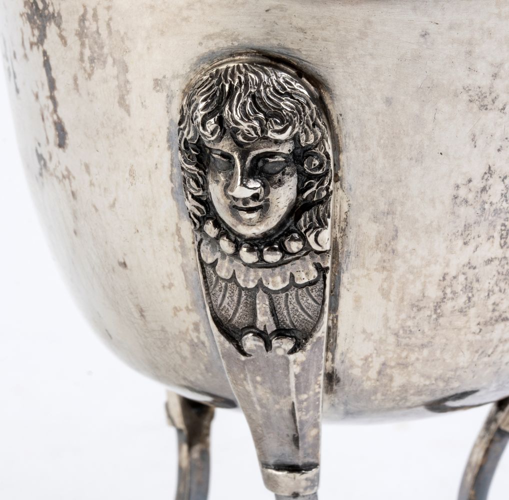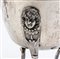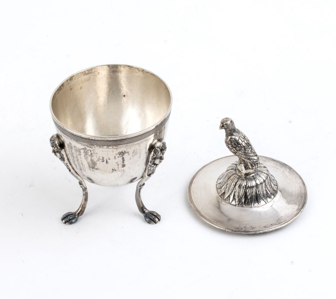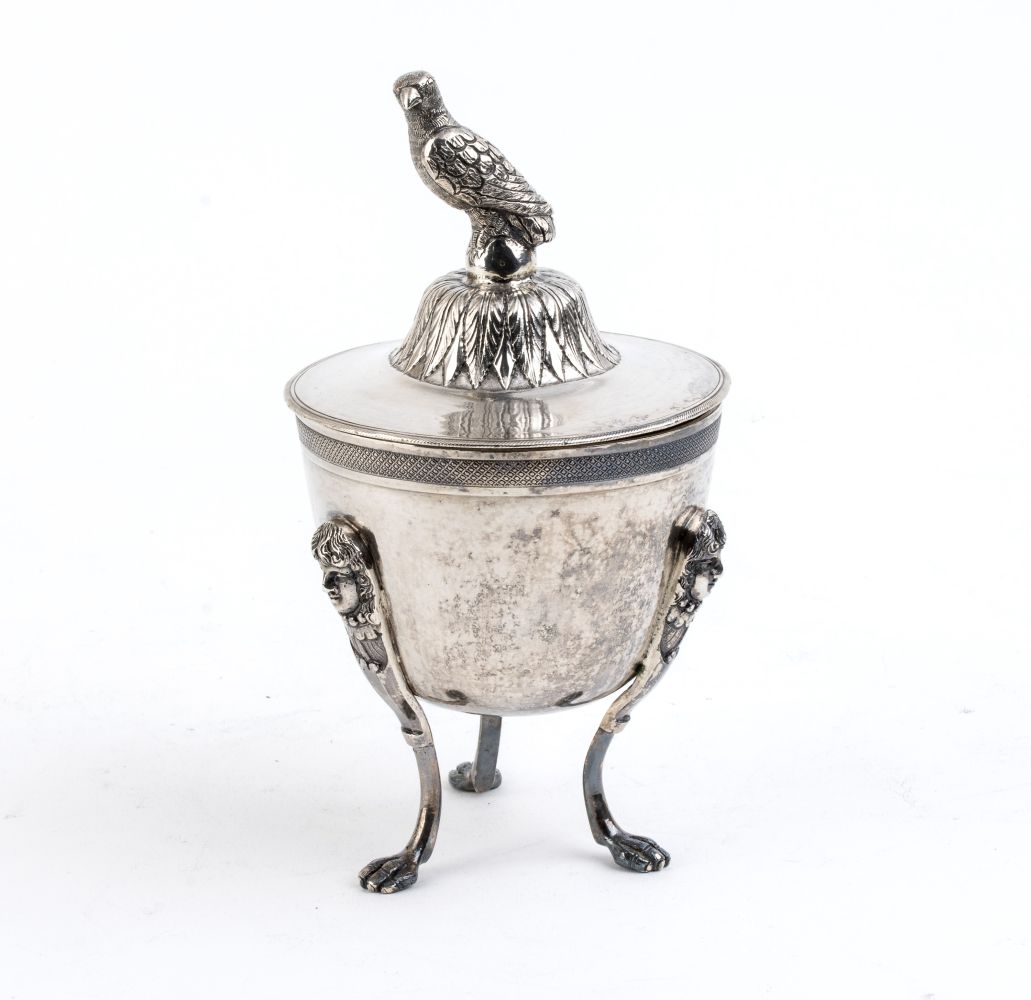 a tre piedini con corpo a uovo, coperchio fortemente duomato con cimasa a forma di rapace. Punzonata con il marchio in uso alla corporazione degli orefici di Napoli per l'argento al titolo di 833/1000, 1832-1872, argentiere non identificato.