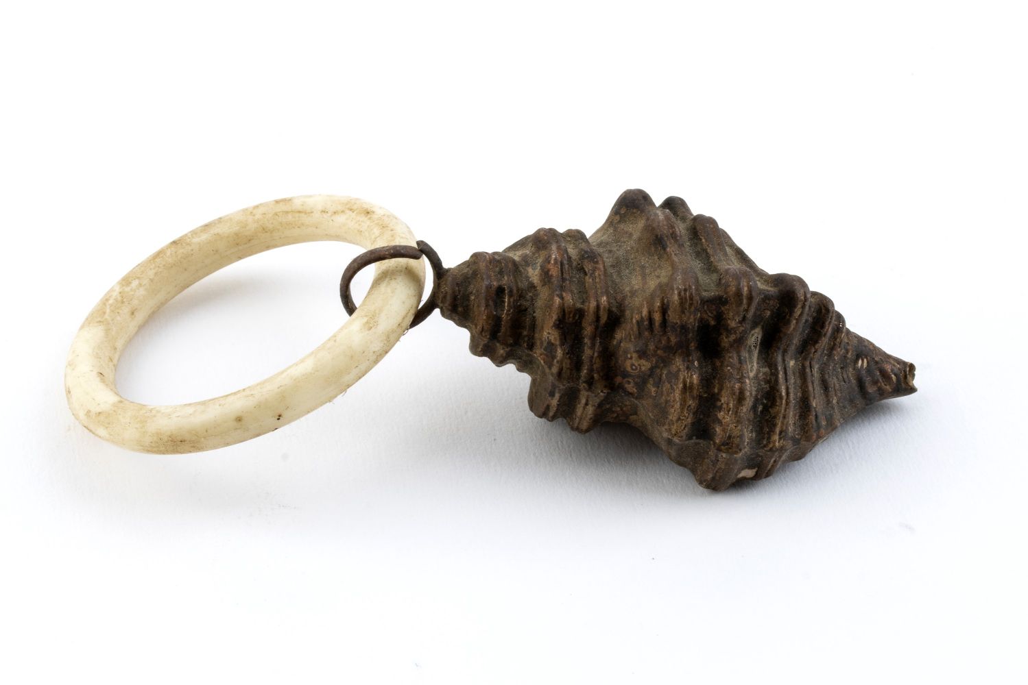 c) in metallo dorato forma di conchiglia con anello in osso, apparentemente non punzonato.