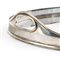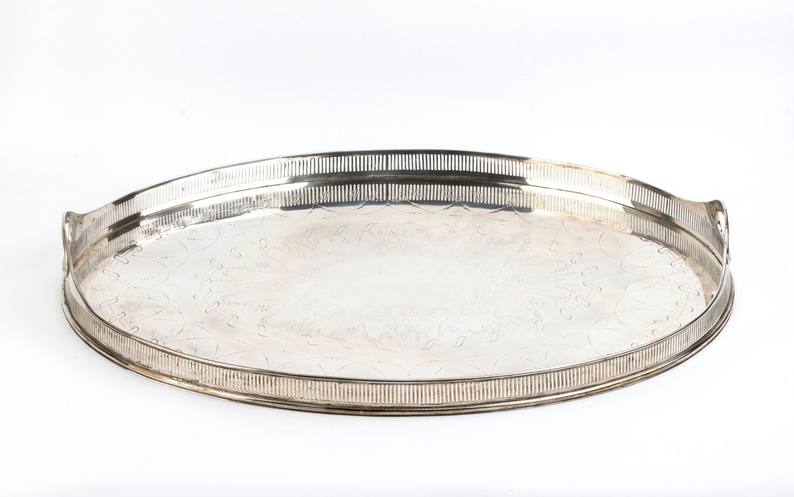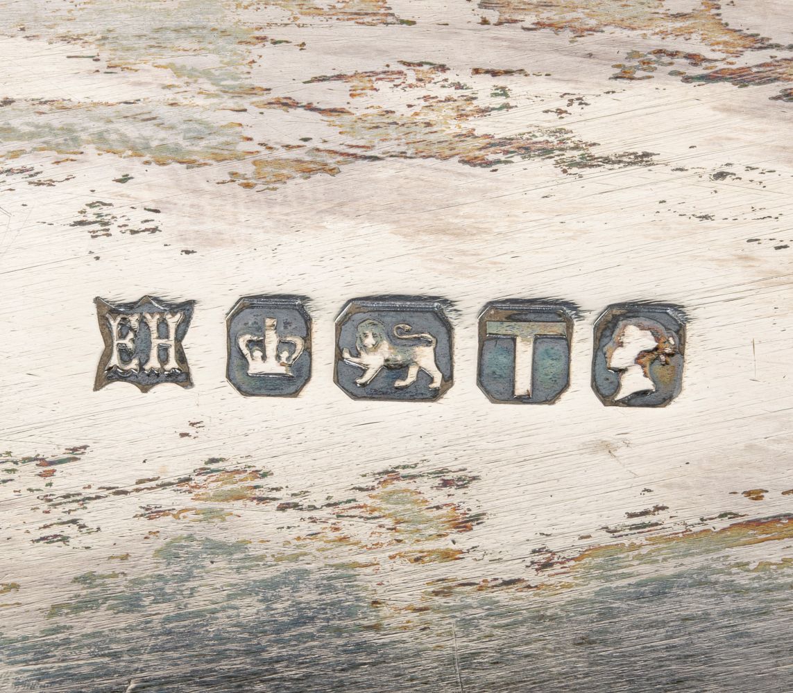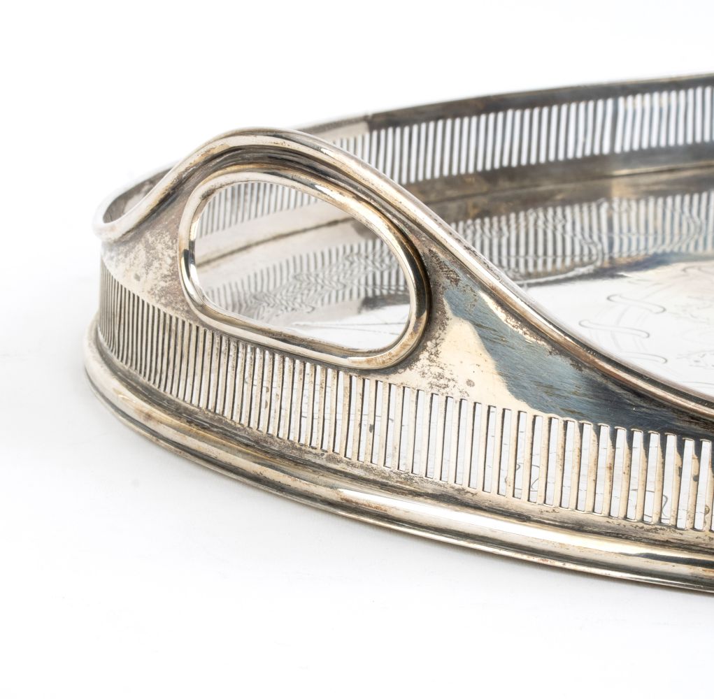 di forma ovale con ringhiera perimetrale traforata e manici laterali, inciso a taglio luce con una doppia cornice a festoni e una riserva centrale a tulipani. Argento 925/1000, serie compelta di marchi città di Sheffield 1861-1862, argentieri William Hutton & Sons (Edward Hutton).