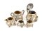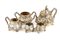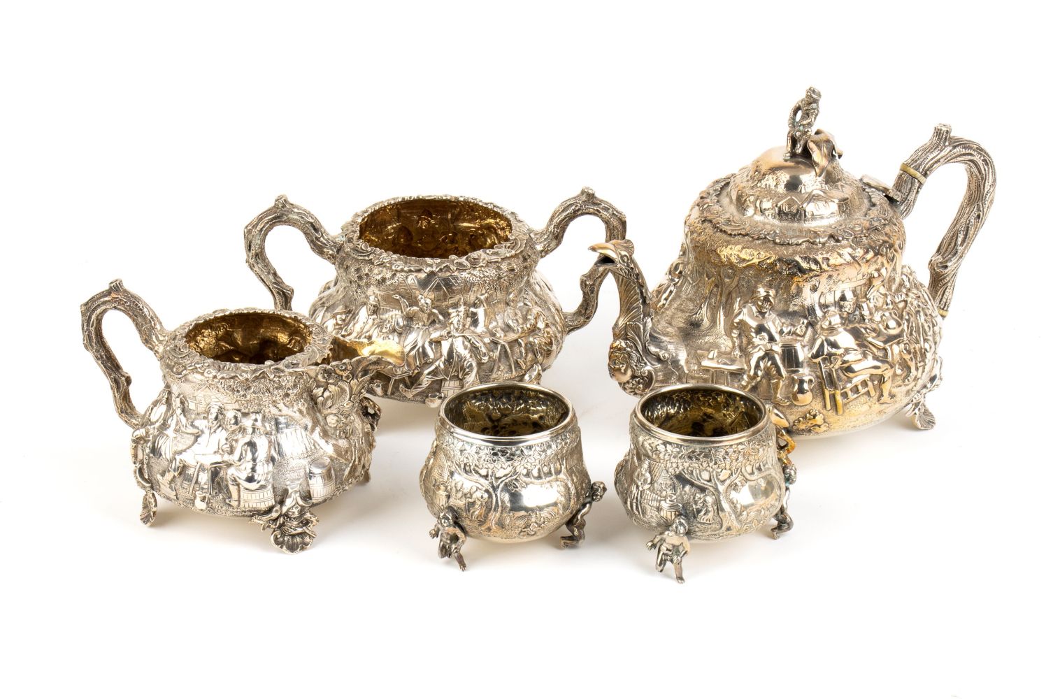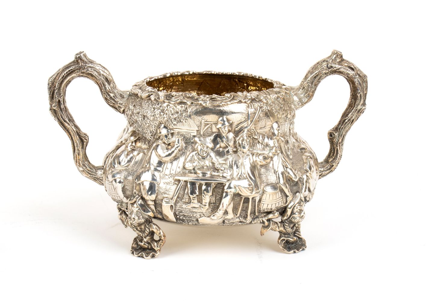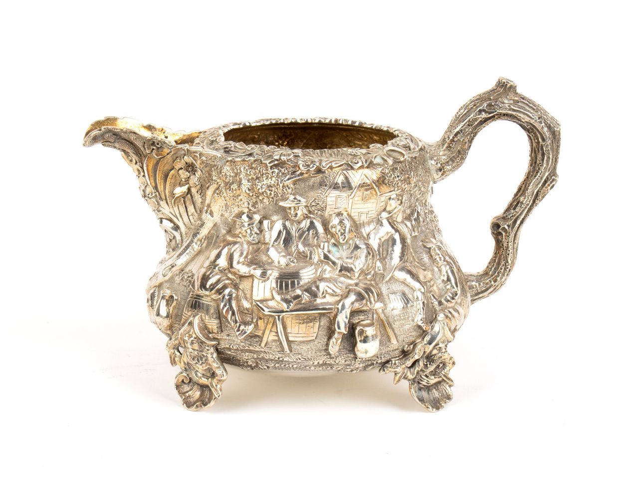 Teiera, zuccheriera e lattiera, decorate con scene di taverna. Argento 925/1000, serie completa di marchi Londra 1868-1870, argentiere Richard Sibley II.