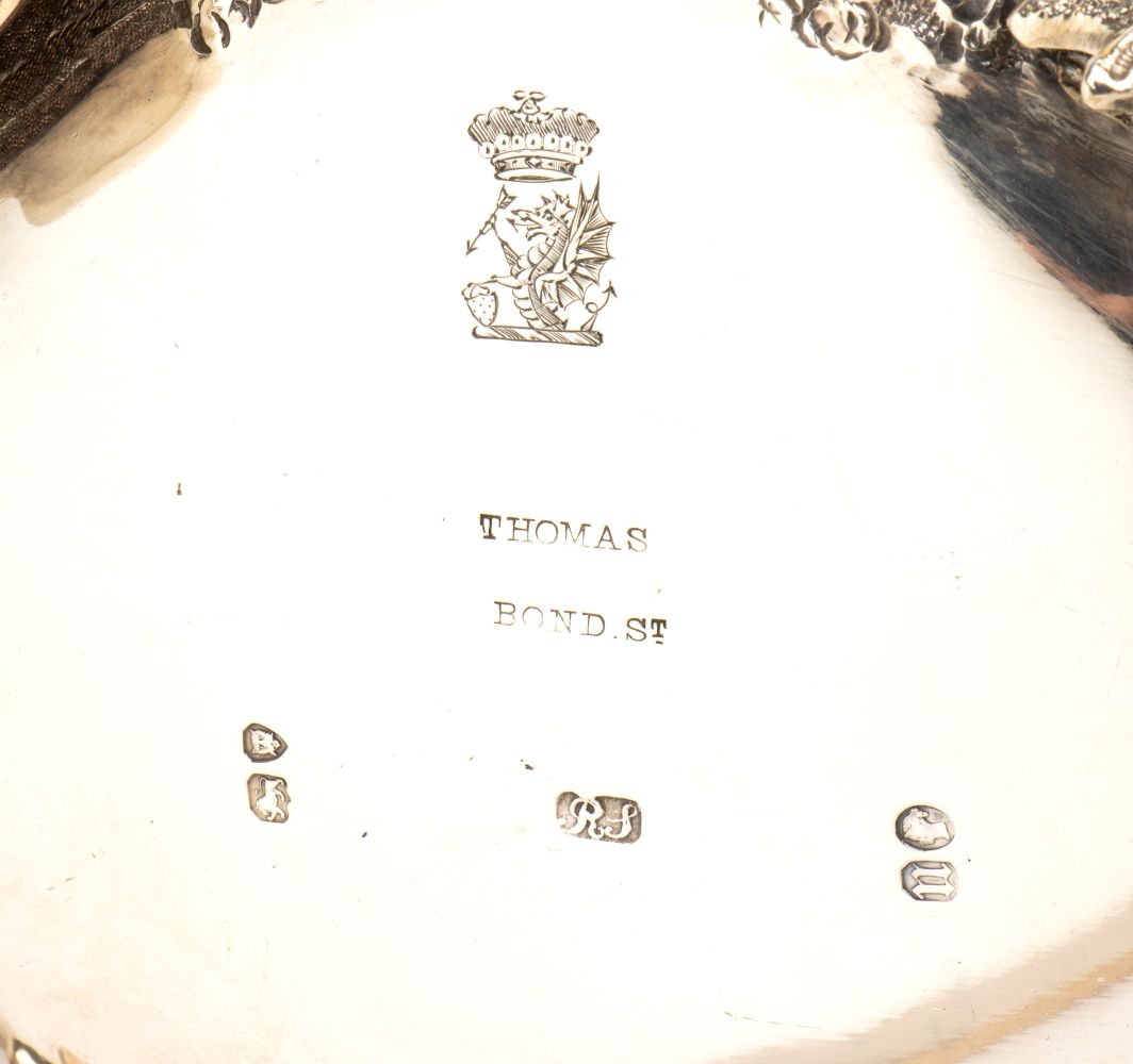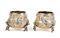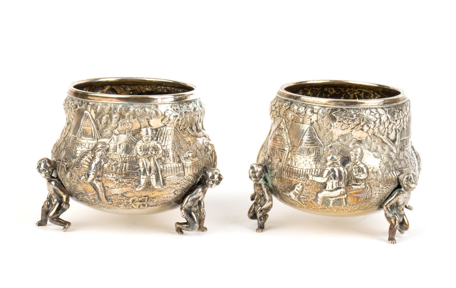 Coppia di saliere decorate con scene di genere. Argento 925/1000, serie completa di marchi Londra 1861-1862, argentieri Edward, Edward junior, John & William Barnard.
