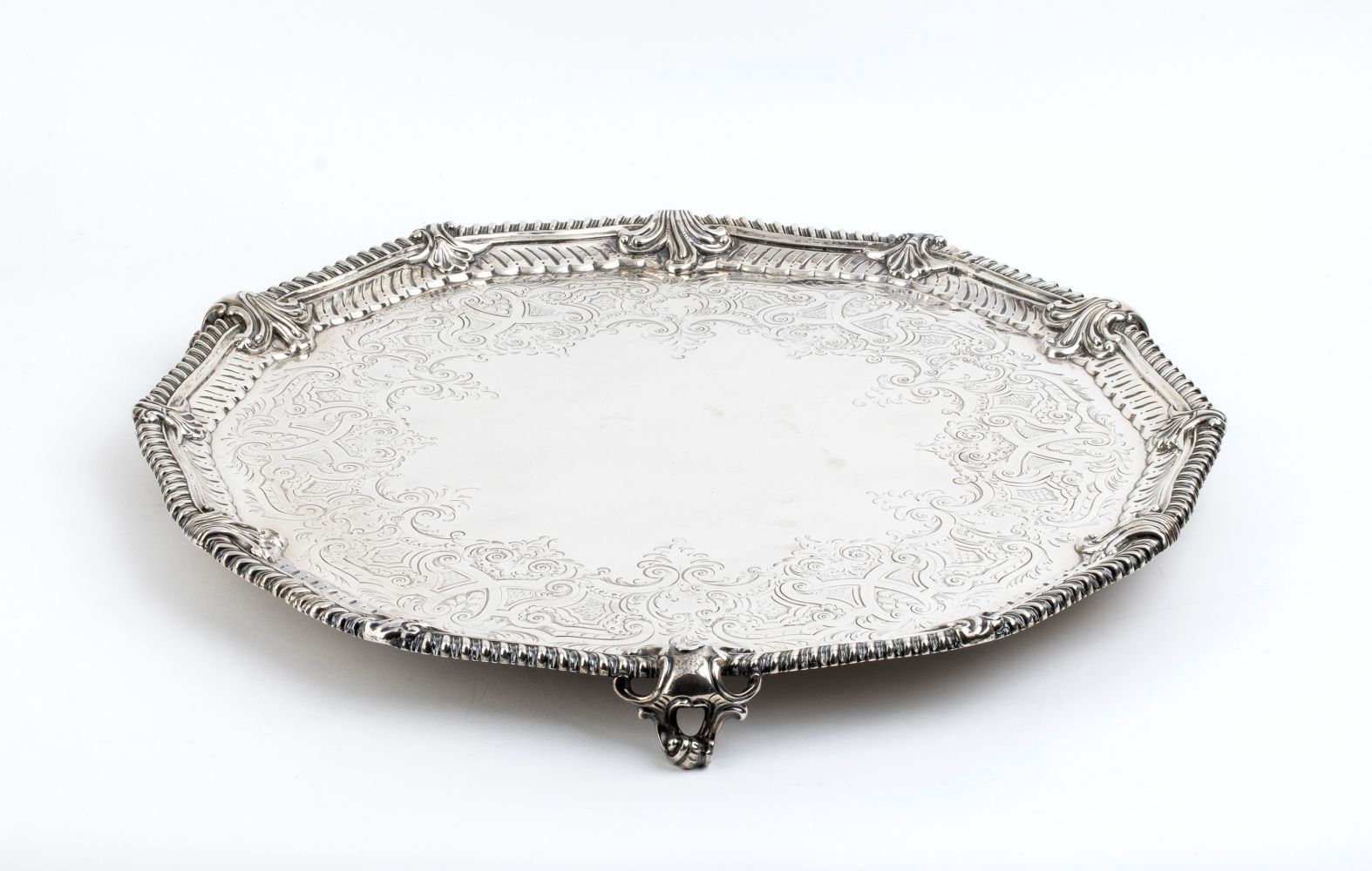 di forma rotonda poggiante su tre piedi a voluta vegetale, con bordo godronato e ricca decorazione a bright cut a volute vegetali.