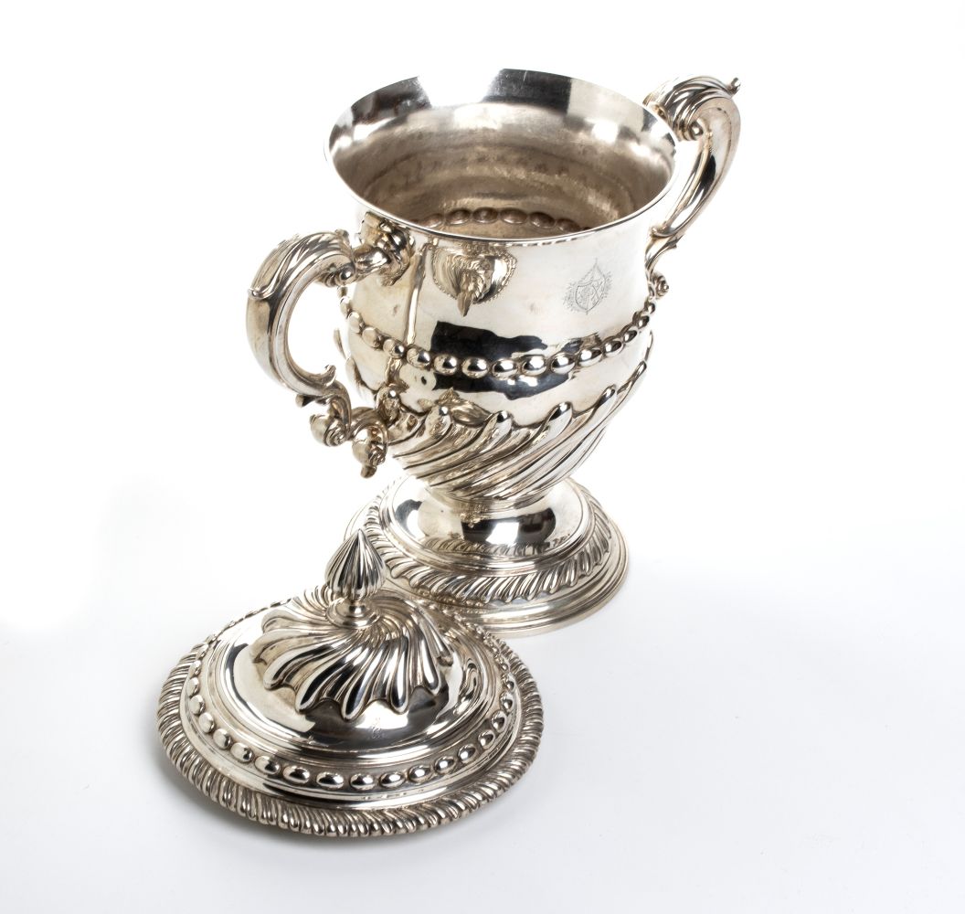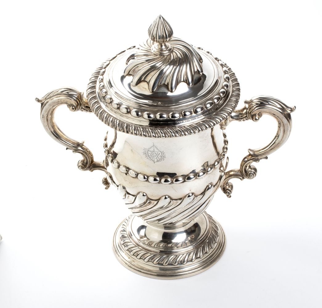 Piede circolare gradinato, parte inferiore del corpo e coperchio con nervature tortili e manici laterali a doppia voluta; sul corpo è inciso uno stemma nobiliare. Argento 925/000, serie completa di marchi Londra 1844-1845.