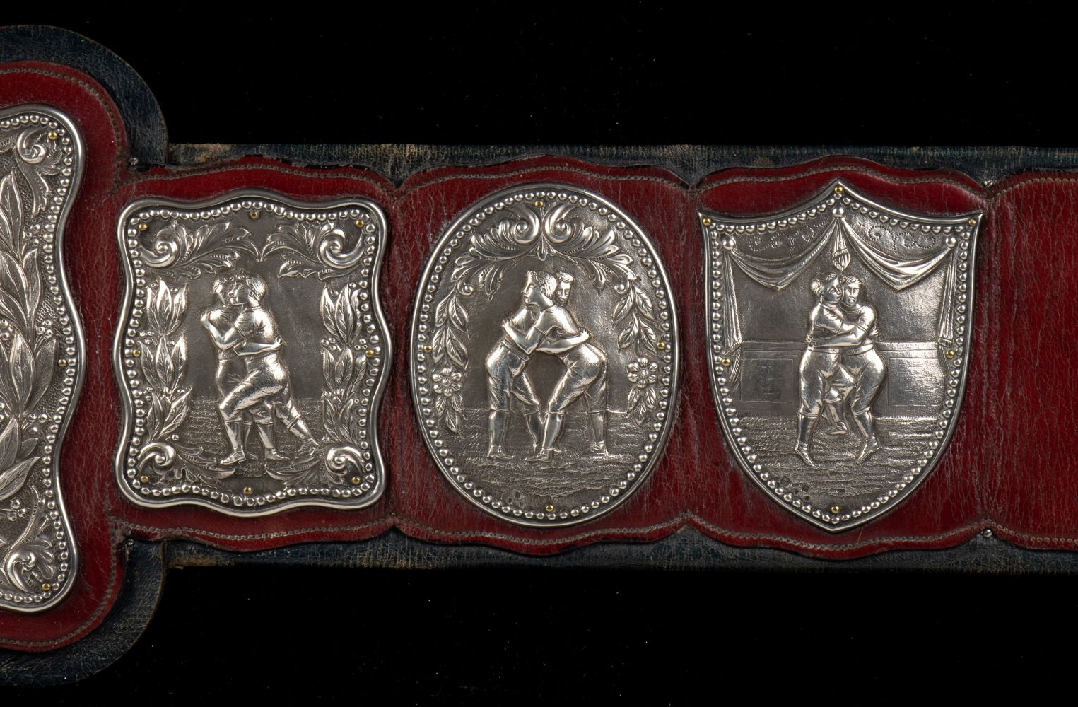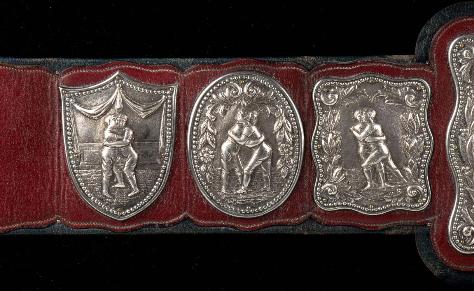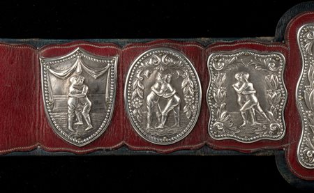 Rara cintura da campione di lotta libera, vittoriana inglese con applicazioni in argento e oro Londra 1898-1899