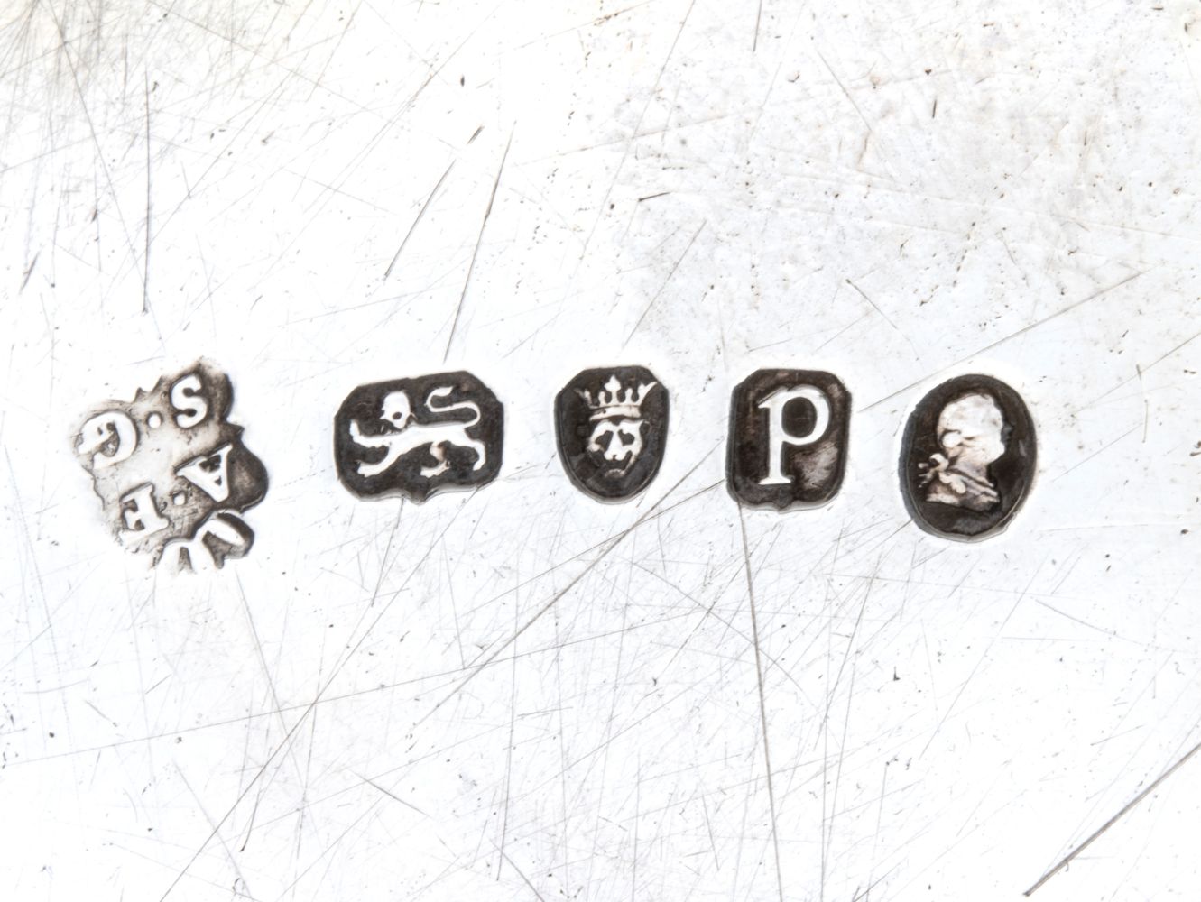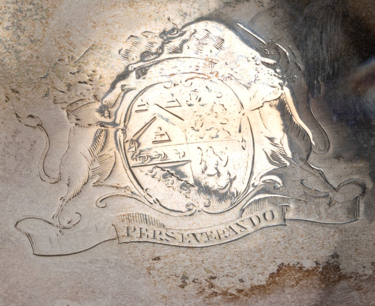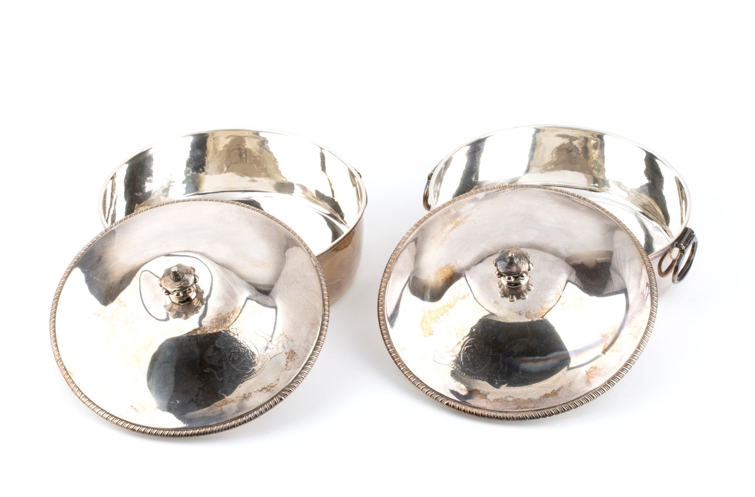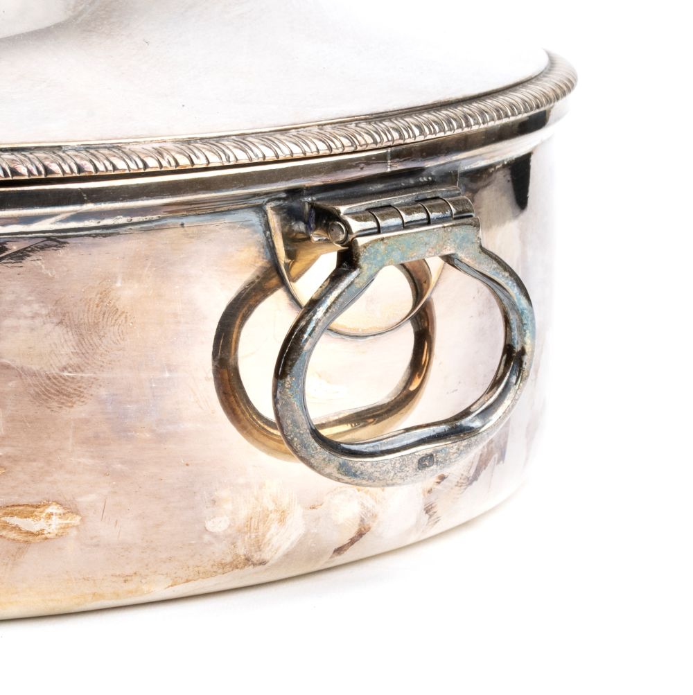 di forma circolare con manici laterali, coperchio con chiusura ad innesto e stemma nobiliare. Argento 925/1000, serie completa di marchi Londra 1810-1811, argentieri Andrew Fogelberg & Stephen Gilbert.