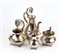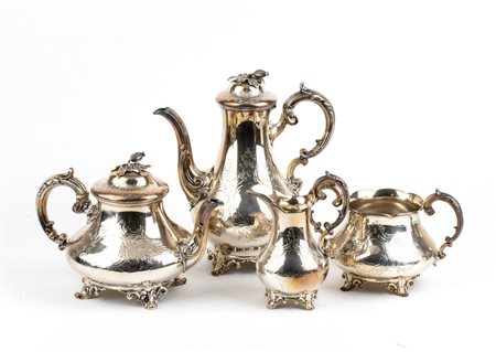 composto da caffettiera, teiera, zuccheriera e lattiera, a decori vegetali poggiante su quattro piedi fogliati. Argento 925/1000, serie completa di marchi Londra 1850-1851, argentieri Edward, John & William Barnard.