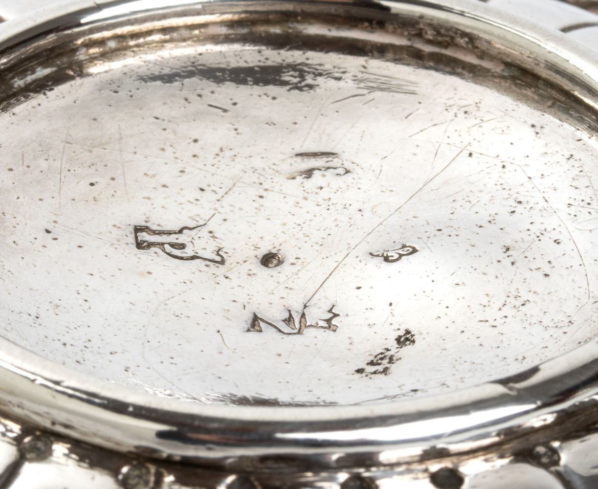 b) punzonato con marchi francesi dell'Ancien Régime, XVIII secolo, tra i quali si identificato quello della giuranda di Parigi del 1716 e il marchio di scarico per gli oggetti non caricati del 1717. Su di un lato l'iscrizione "Domenicho Zibeta Vitrier Svise".