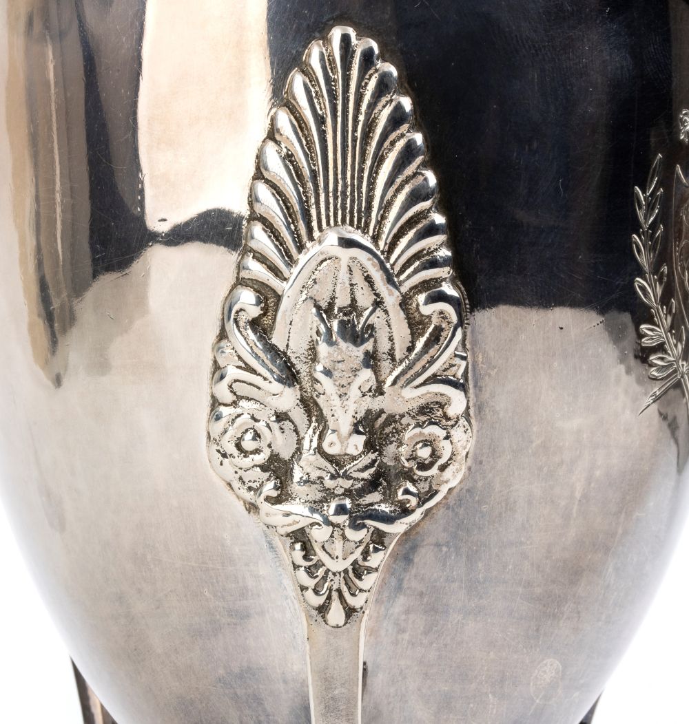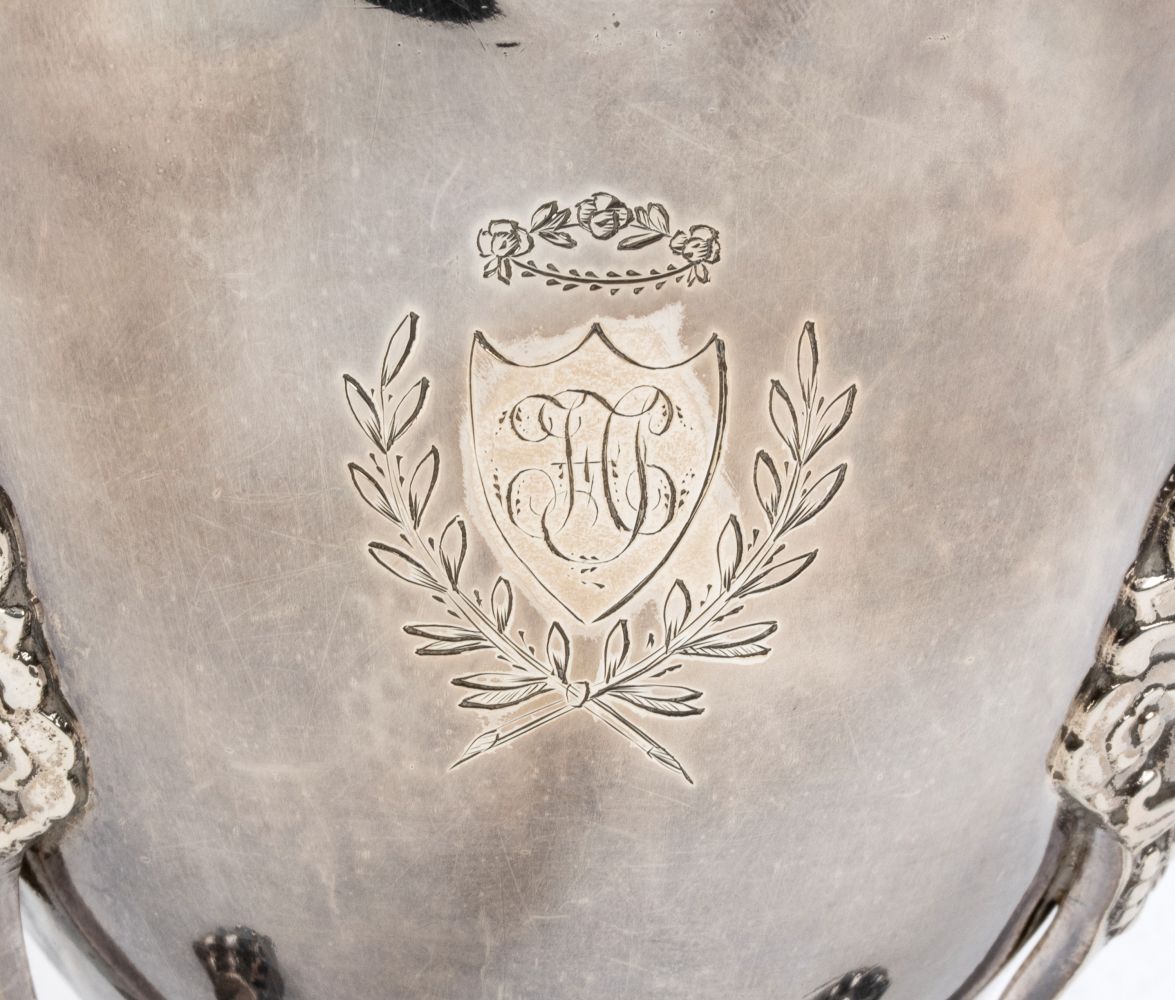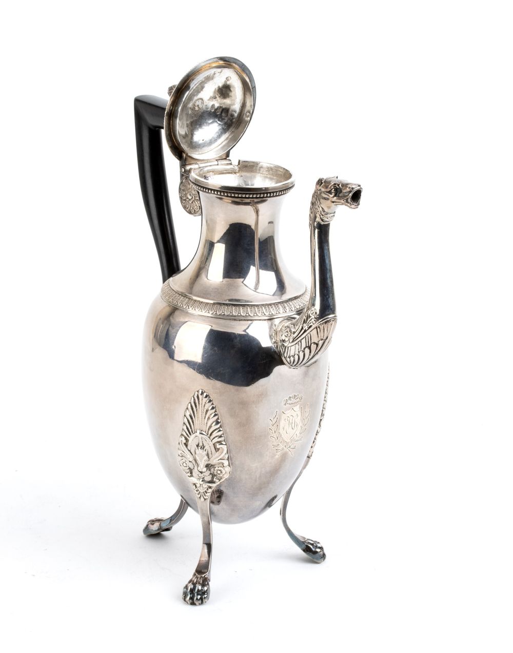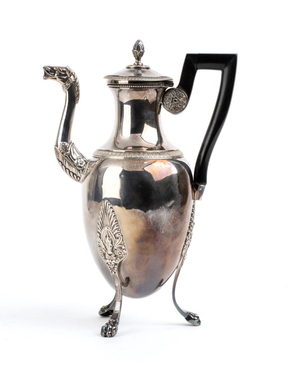 corpo ovoidale liscio con erma nobiliare poggiante su tre piedini con estremità a zampa ferina e attaccatura superiore a palmentte, collo rastremato con versatoio sagomato e beccuccio zoomorfo. Coperchio incernierato con presa a pigna, manico in ebano. Argento 950/1000, punzonata con i marchi per l'argento al primo titolo in uso a Parigi dal 1819 al 1838, con il marchio non ufficiale utilizzato dall'Association des Orfévres di Parigi per l'argento al primo titolo di 950/1000 "testa di donna greca con numero 1" e con le iniziali S.S. dell'argentiere Sixte-Simon Rion.