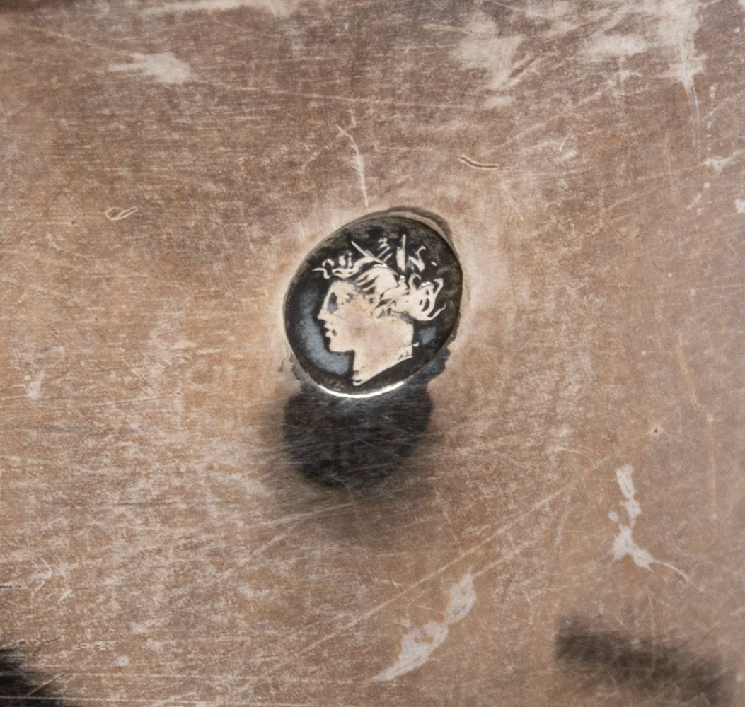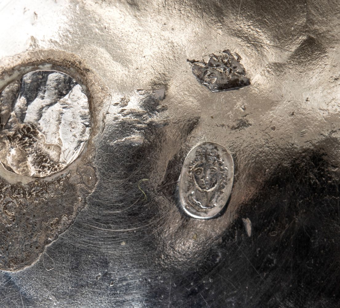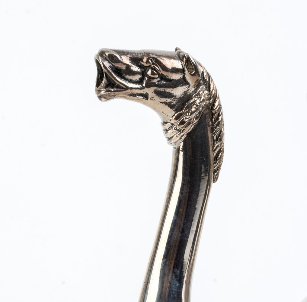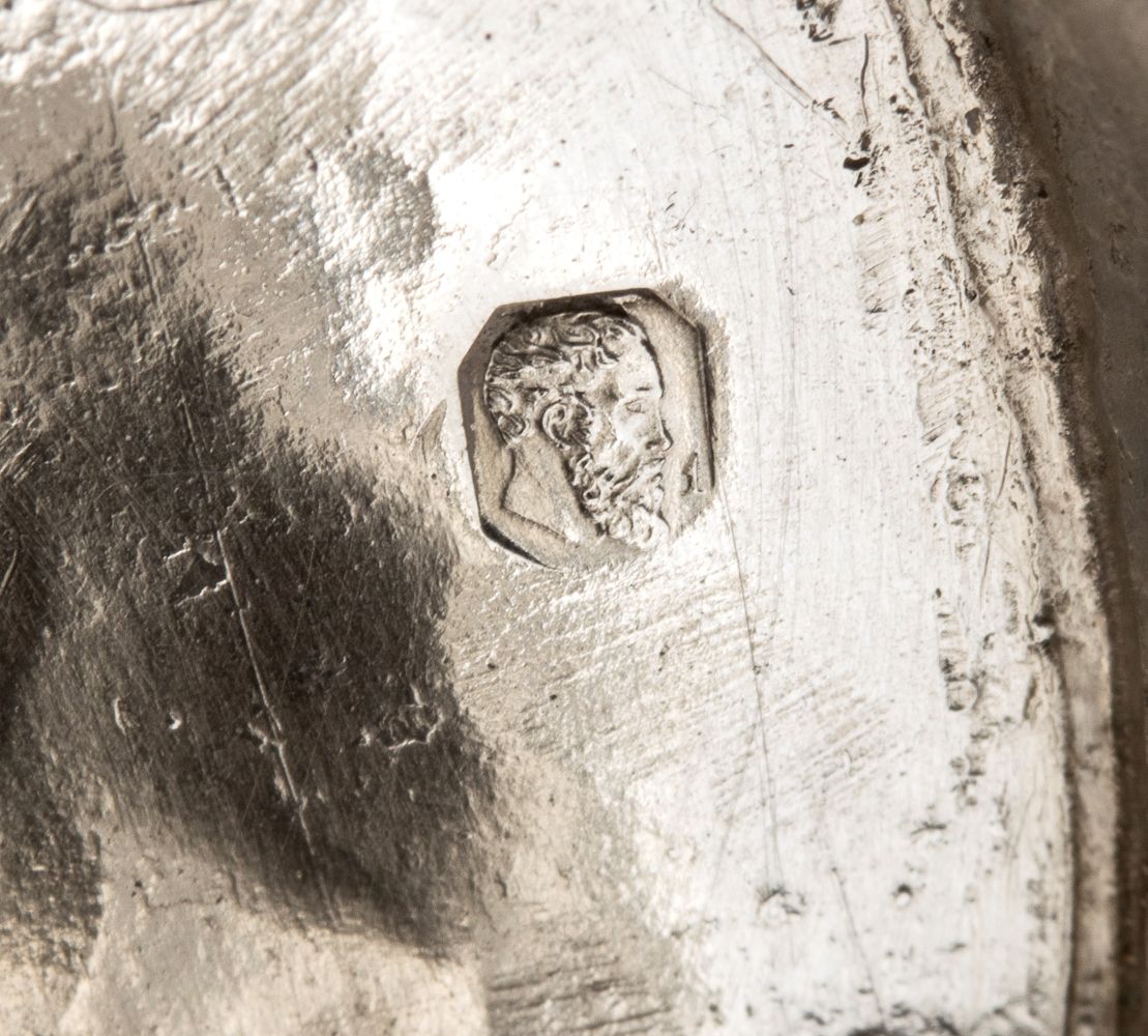 corpo ovoidale liscio con erma nobiliare poggiante su tre piedini con estremità a zampa ferina e attaccatura superiore a palmentte, collo rastremato con versatoio sagomato e beccuccio zoomorfo. Coperchio incernierato con presa a pigna, manico in ebano. Argento 950/1000, punzonata con i marchi per l'argento al primo titolo in uso a Parigi dal 1819 al 1838, con il marchio non ufficiale utilizzato dall'Association des Orfévres di Parigi per l'argento al primo titolo di 950/1000 "testa di donna greca con numero 1" e con le iniziali S.S. dell'argentiere Sixte-Simon Rion.