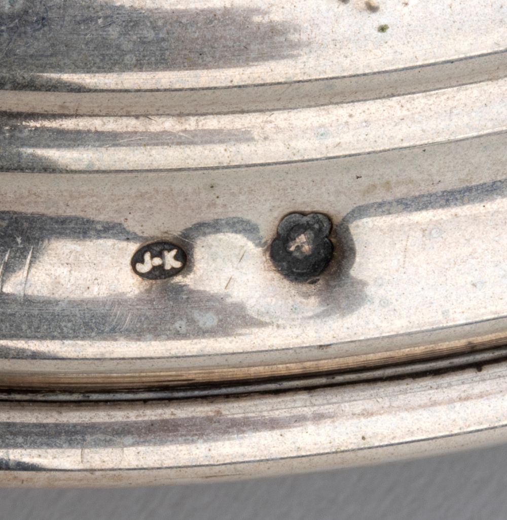 di forma circolare con decori floreali. Argento 800/1000, punzonati con i marchi in uso a Vienna, Austria Ungheria, tra il 1872 edl 1922 (marchio della testa di Diana, il numero a sinistra indica la purezza dell'argento, 3 =.800. La lettera a destra indica la città, A = Vienna), argentiere Josepf Kurzweil (1874-1912).