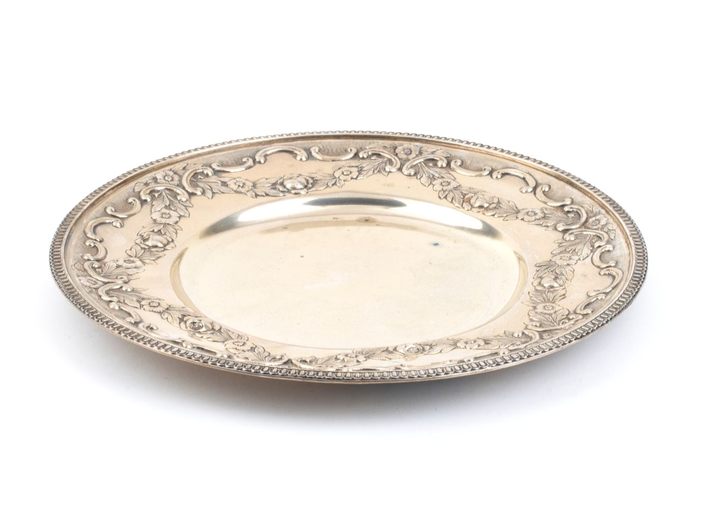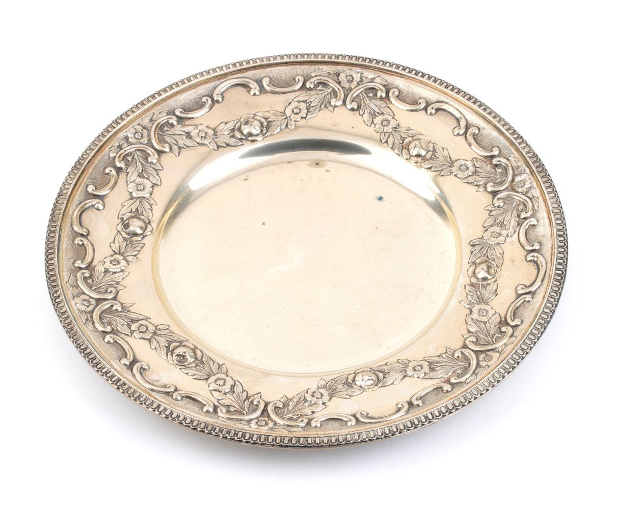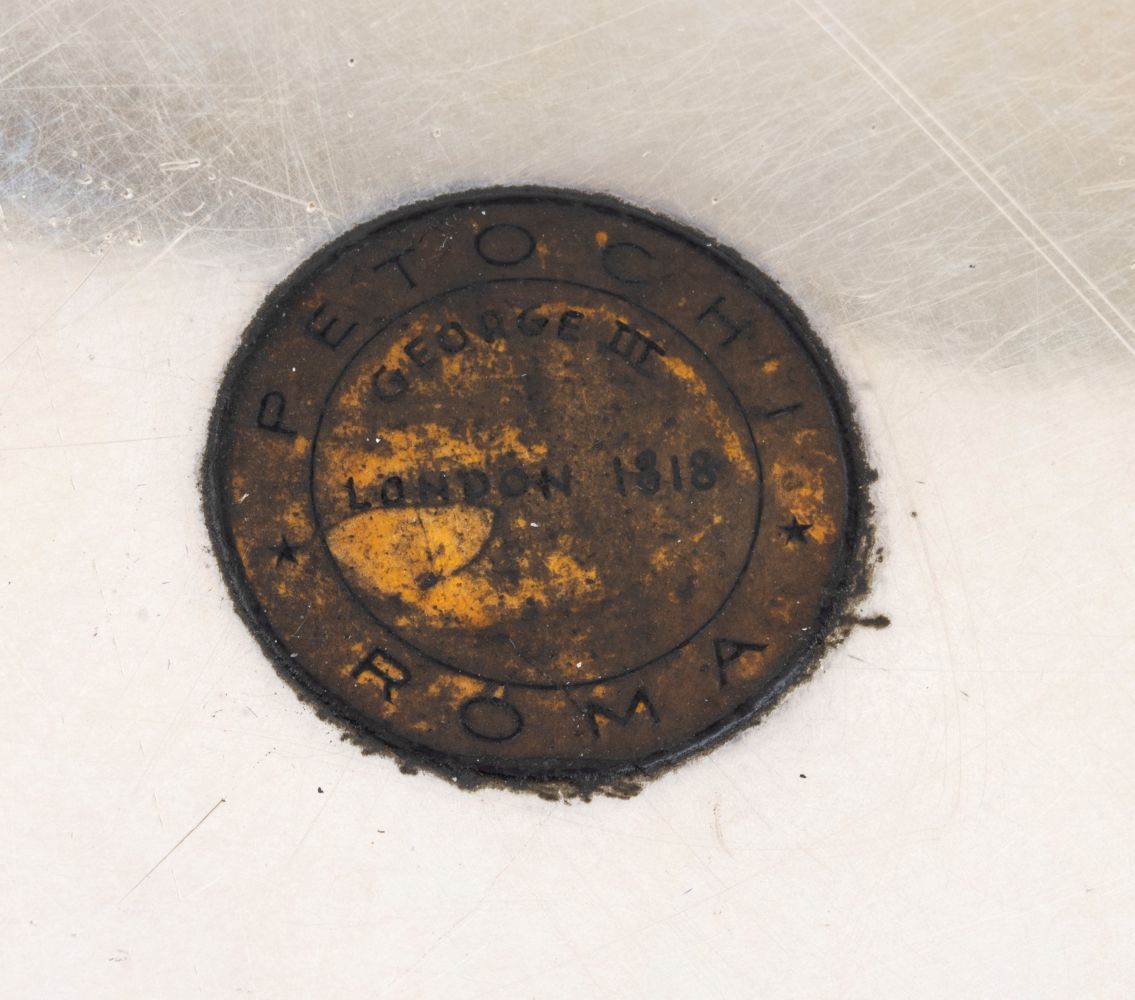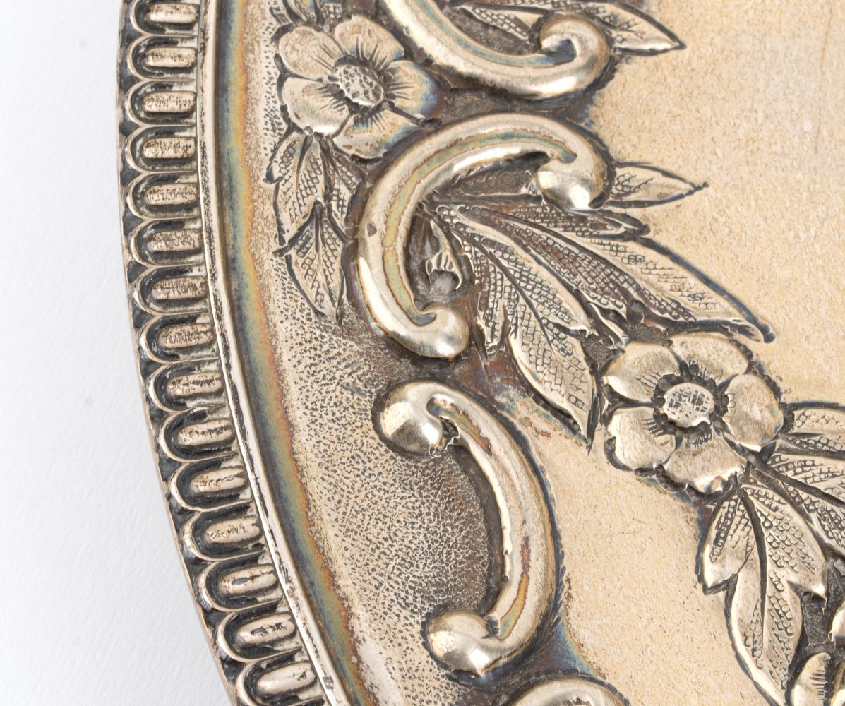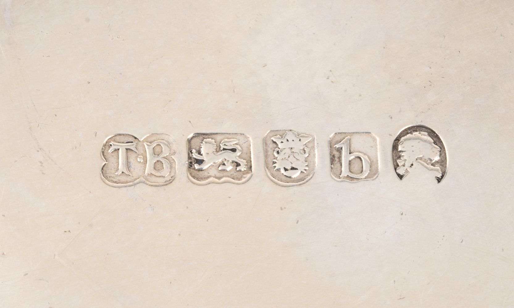 di forma circolare sbalzato e cesellato con festoni fiorati. Argento 925/1000, serie completa di marchi Londra 1817-1818, argentiere "T.B" Thomas Wilkes Barker (?).