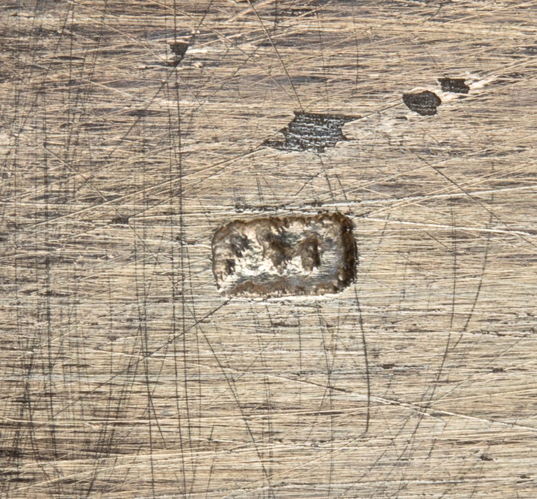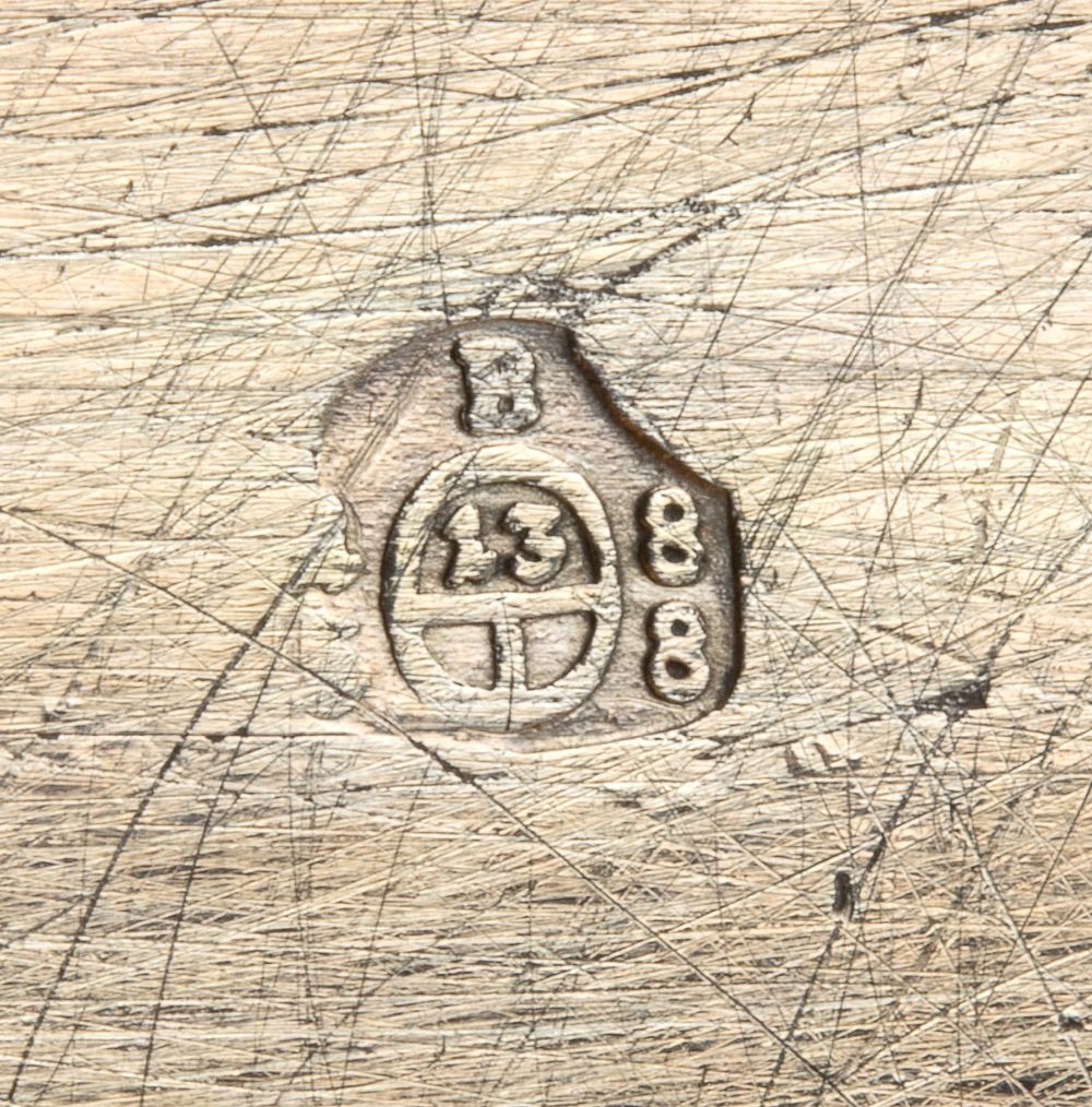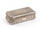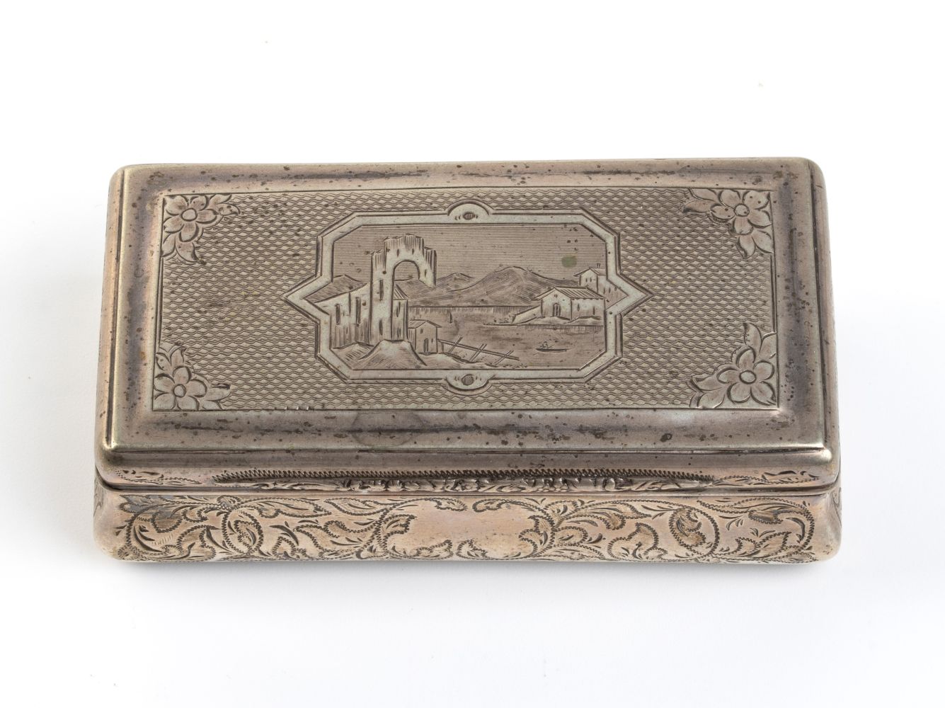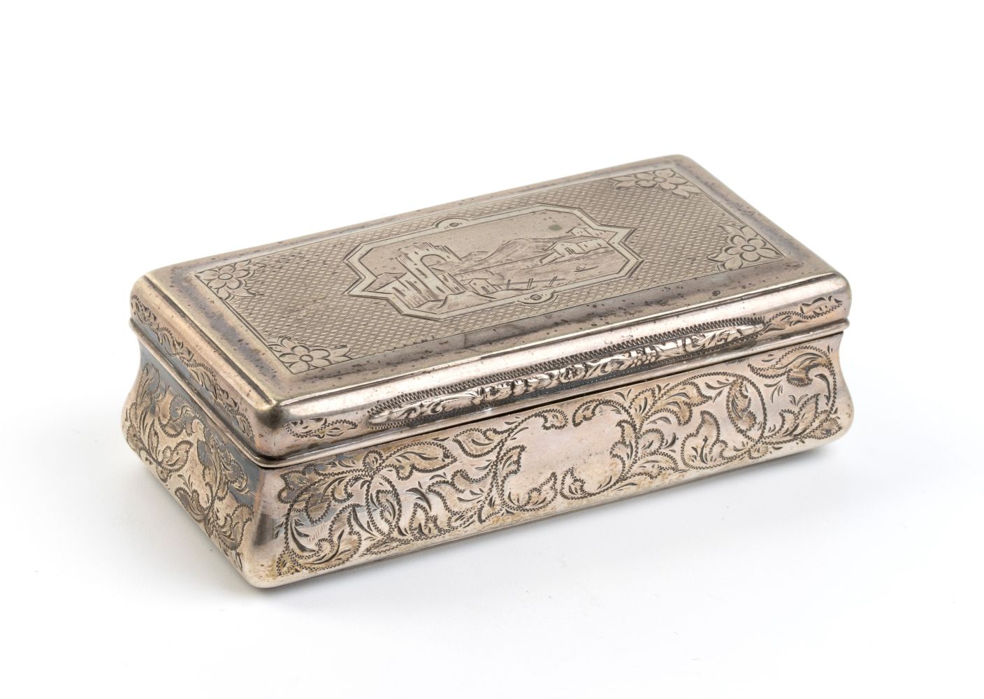 di forma rettangolare con coperchio incernierato, corpo inciso a decori vegetali coperchio un paesaggio entro riserva rettangolare; punzonata con la serie completa di marchi per l'argento al titolo di 13 Loth (812/1000) in uso a Praga nell 1888.