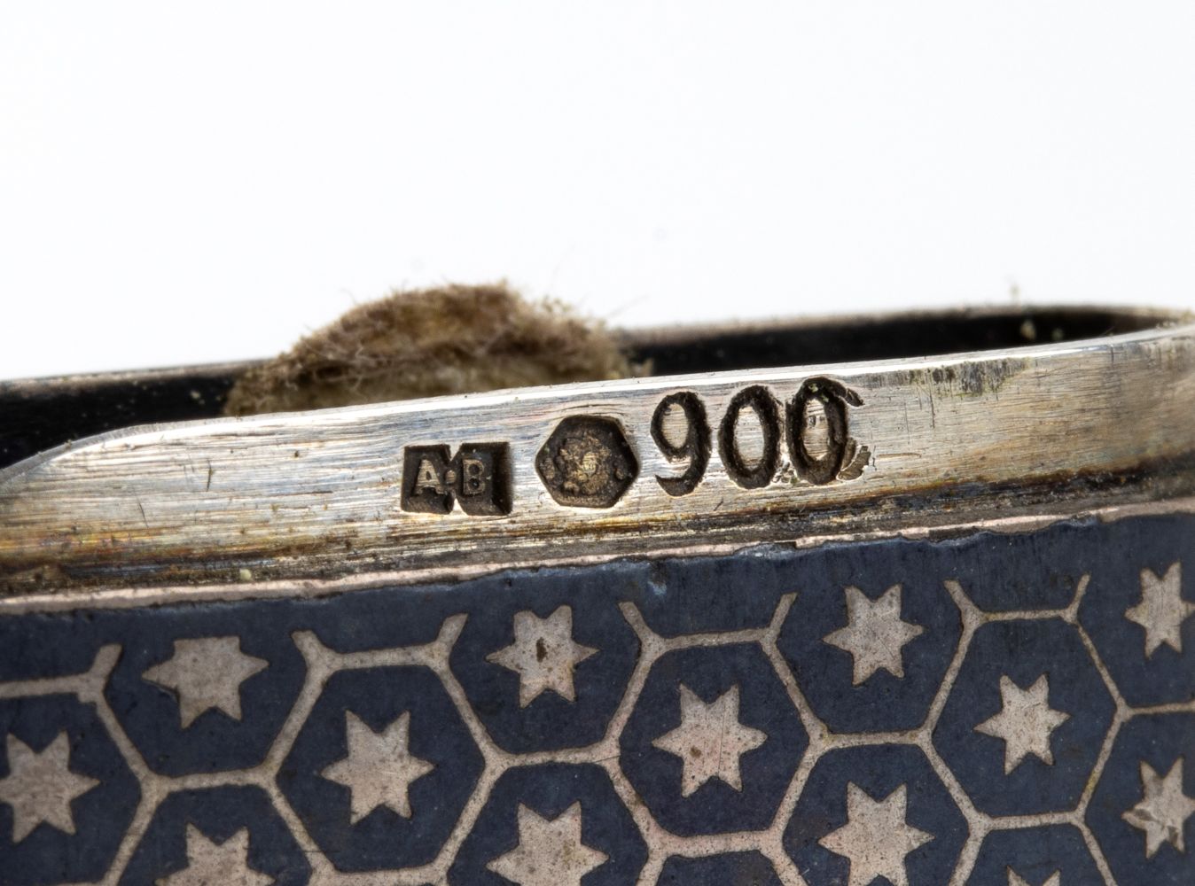 b) di forma rettangolare con coperchio incernierato, interamente niellato a motivi geometrici; punzonato con i marchio francesi in uso dopo il 1838 per l'argento al titolo minimo di 800/1000.